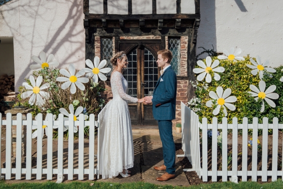 Beyond the pretty palette, the beauty of a spring wedding lies in details such as buttons, daisies and daffodils in full bloom, and even sweet grey bunnies. Alongside the bridal make-up, focusing on soft smoky eyes and muted lips, the loose braided updo and a delicate headpiece, the vintage lace of the bridal gown and gentle tulle of the bridesmaids' dresses allow the natural prettiness and fresh background colours to shine through, setting the scene for the most gorgeous garden party wedding.