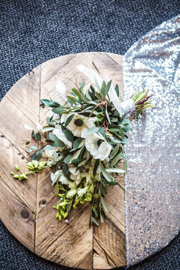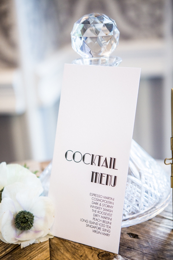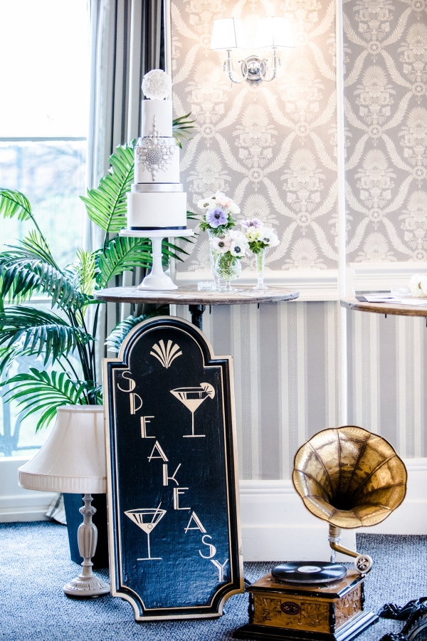 Elegance pervades throughout the styling, from the lace-edged vintage gown to the cut-glass whisky decanter sitting atop a dark oak bar table. The opulence of the Jazz Age provides inspiration for touches such as the feathered headpiece, the tiered cake embellished with gems and silver accents, and props such as the globe bar and gramophone.