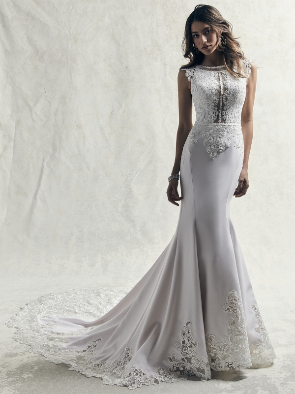 Then there's Sottero & Midgley, with delicate lace motifs woven into show-stopping fit-and-flare frocks replete with eye-catching detail, including one of the stars of the show, Sloane, a stunning sheath featuring a gorgeous jewel neckline, illusion plunge and waistline and pearl buttons.