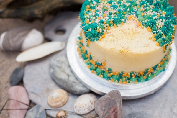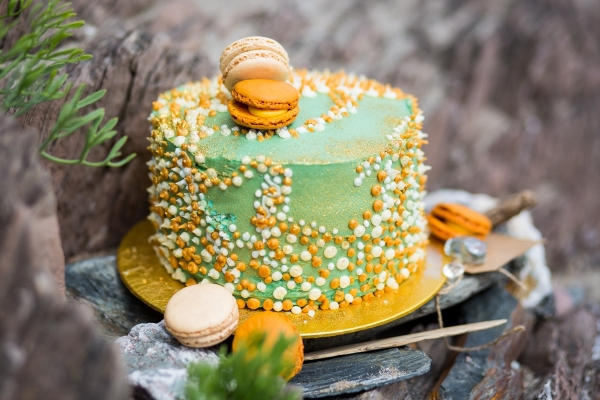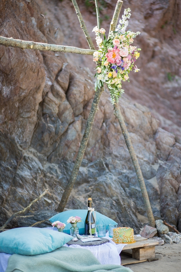 "Our palette was sea green and sand with touches of pink and gold - a beautiful contrast to the slate grey backdrop," she says. An array of palettes, rugs and cushions helped achieve the relaxed vibe, while hazel branches bedecked with flowers and ribbon created a pretty backdrop, and popped with colour against the rocks.