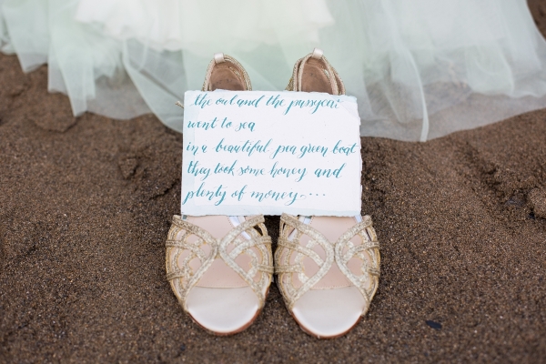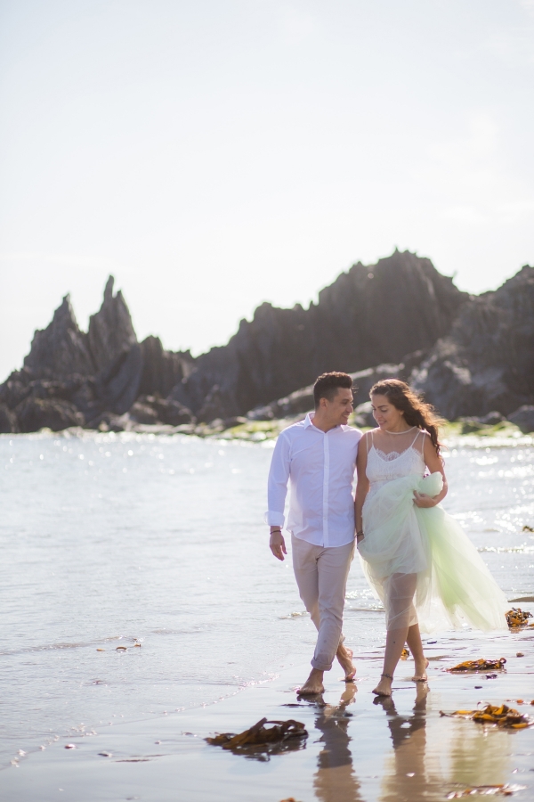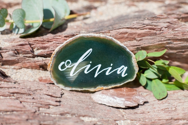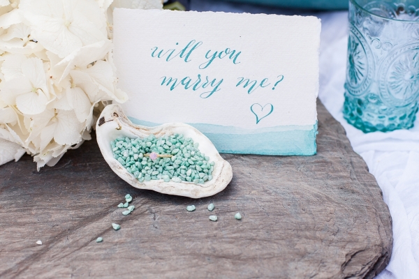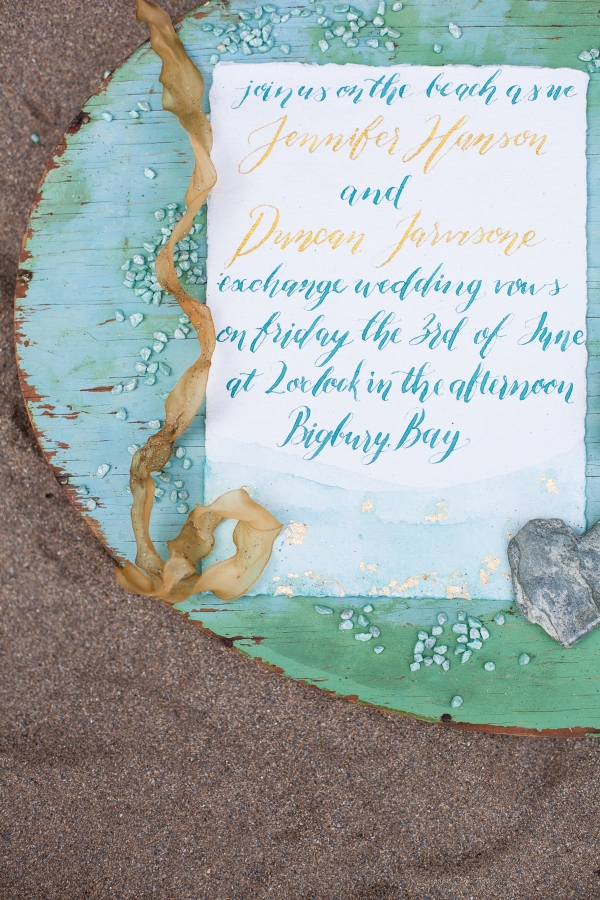 The romantic shoot involved Juan leading Carolina to a gorgeous green dip-dyed floaty dress and shoes. She then followed a path of clues, all calligraphed on driftwood,
