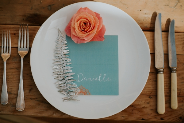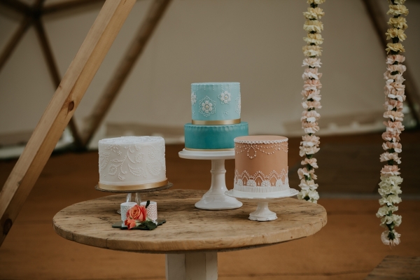 "I was inspired to use a punchy ginger and mint colour scheme based on current trends and a twist on an Indian summer vibe," explains stylist, Bridget Scott of Blue Fizz Events. Henna patterns were key to the aesthetic and carried through the eye-catching stationery and intricately embellished cakes, while mirroring the warm palette.