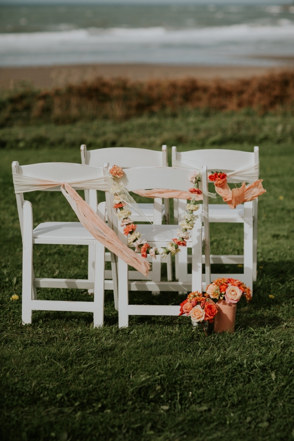 The looks of the bride and groom carry the gorgeous aesthetic of clean lines, pops of colour and laidback vibes. The groom makes a coolly contemporary statement in a vibrant tangerine jacket teamed with neutral shades, while the bride wears layered vintage gowns - "to create a delicate silhouette and individuality" - a sleek pony tail and warm make-up with a delicate touch of ginger colour. "The look was completed with silver henna tattoos on the hands and wrist to bring the overall theme together perfectly," says Bridget.