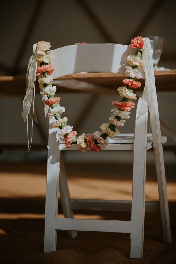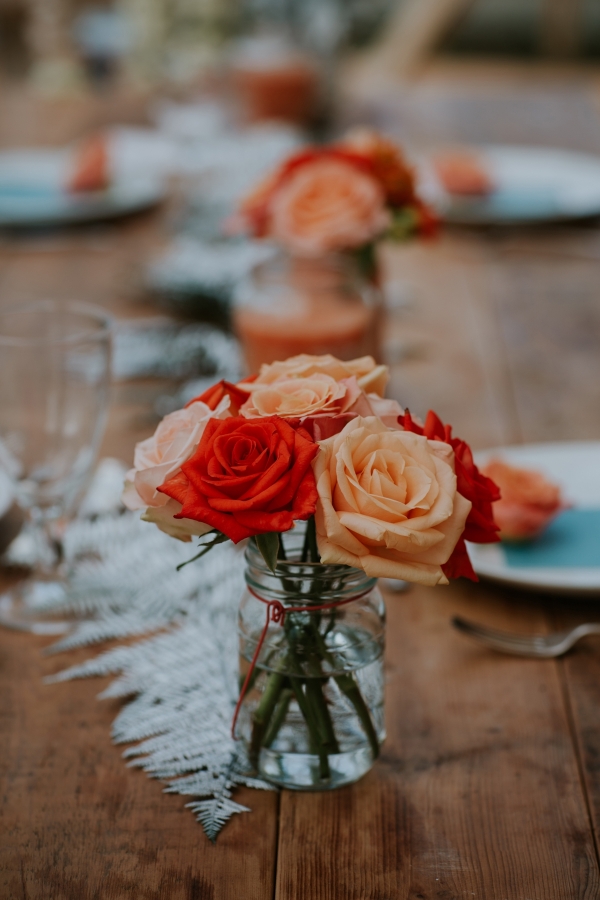 "I fell in love with Indian flower garlands and wanted these to tie in with the ginger colours, with complimentary flower arrangements for the wooden tables," says Bridget. "I opted for a flower garland in a traditional style rather than a bouquet to continue the relaxed, unfussy vibe." The table styling echoed this simplicity. "I used upcycled jars with enamel paint to hold the flowers, silver ferns and simple lanterns."