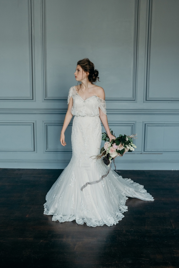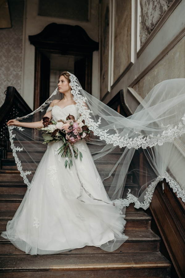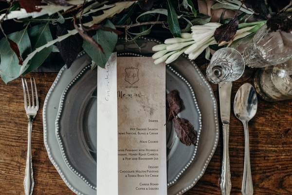 The use of luxurious fabrics and lavish accents juxtaposed against bare brick, plaster and rust finishes epitomises the Industrial Luxe aesthetic. Antique cutlery, chunky vintage keys and old-fashioned bottles with tapered candles sit alongside free-flowing elements such as loose, dark blooms, and undone hair enhanced by bejewelled hairpieces and ethereal make-up.