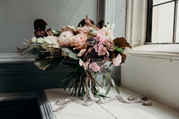 Faded pinks, greys and browns bring a design-led washed out and windswept mood, while the styling creates a feeling of undiscovered beauty. With flowers tumbling from the urn and around the table, it evokes nature moving indoors, bringing the outside in and letting it run wild.