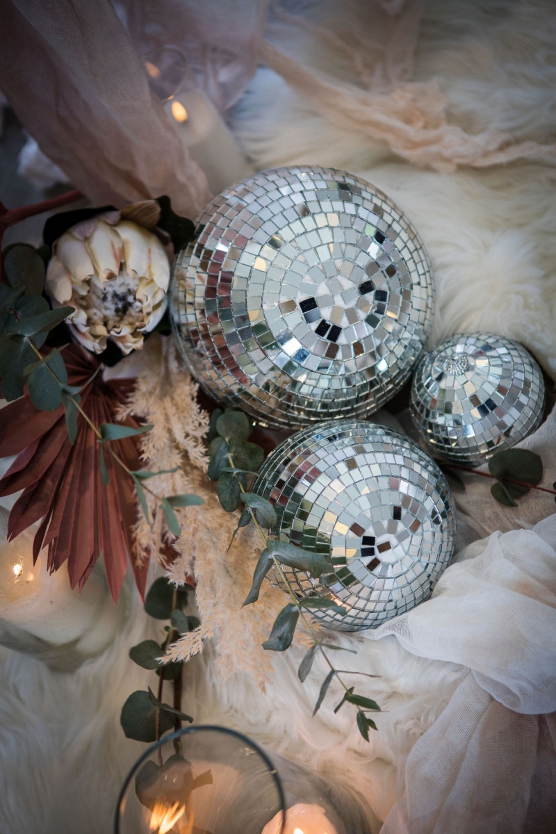 A subtle hint of glamour and frivolity is infused via silver accents and disco ball features, while the warm glow of candlelight and retro-style light letters provides the perfect atmospheric touch. The bride's off-the-shoulder sweetheart gown oozes old-school romance, while her beau is a picture of classic-meets-contemporary groom's style with a light sage suit and dark green two-piece with dried flower boutonierre. A semi-naked cake, delicate jewellery, stunning stationery, and textural decor completes the romantic winter scene with a free-spirited wild edge.