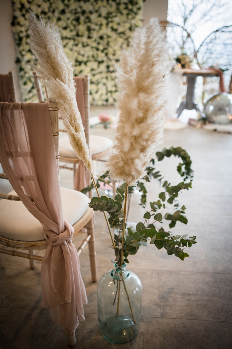 While The Venue's natural palette provides a cool, pared-back aesthetic, the decor is used within the shoot to striking effect to both accentuate and contrast with the natural look and feel of the space, from boho-inspired pampas grass and peacock chairs to the cream coloured blooms and statement flower wall.