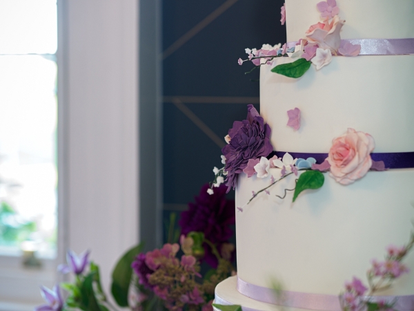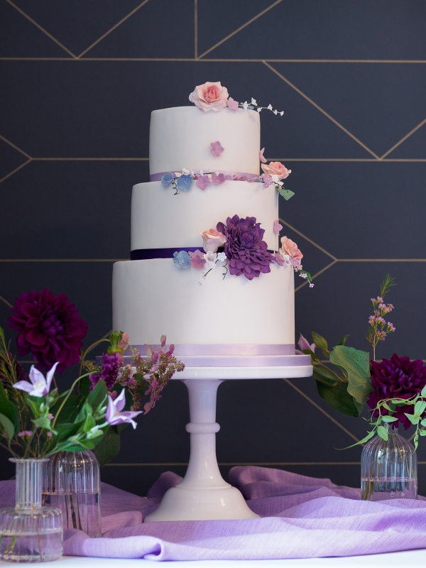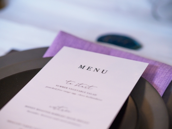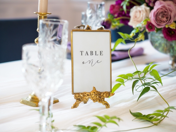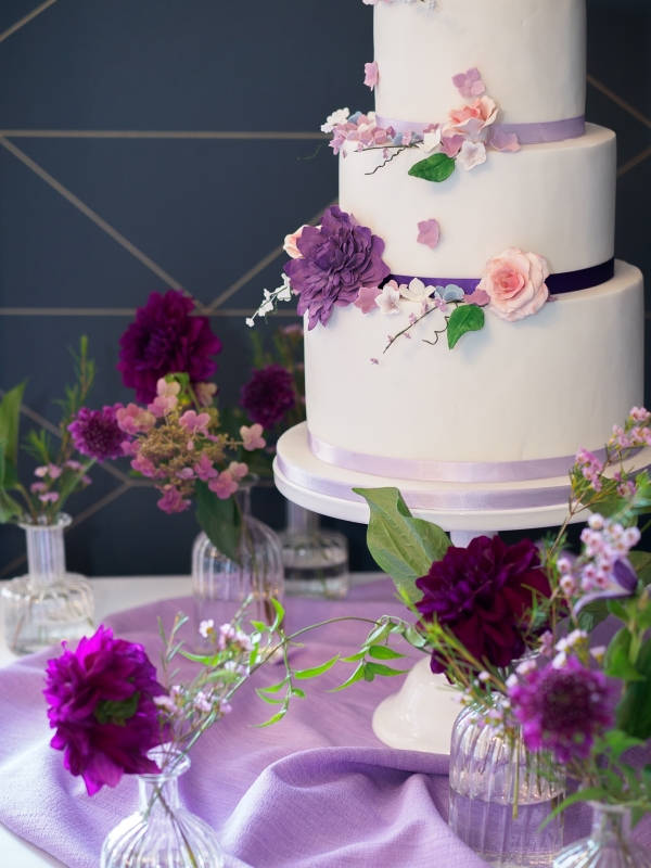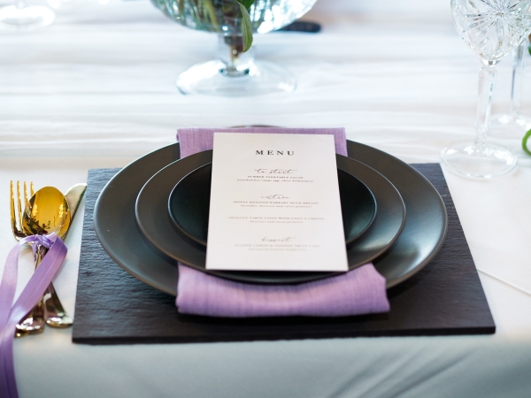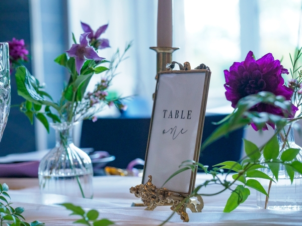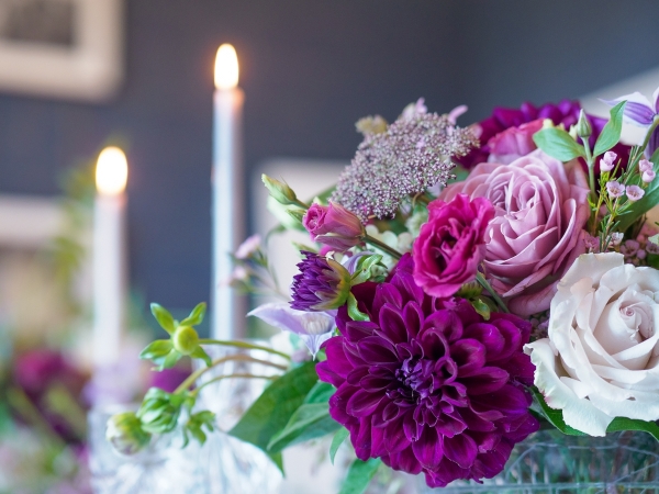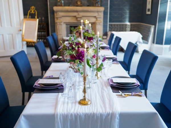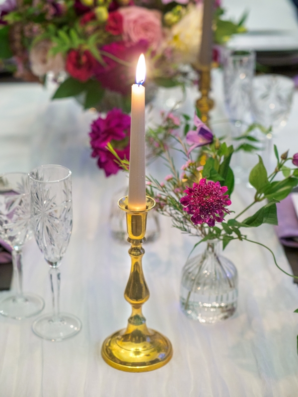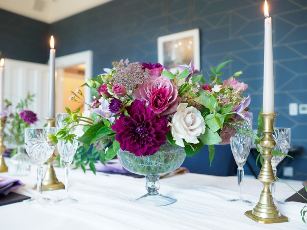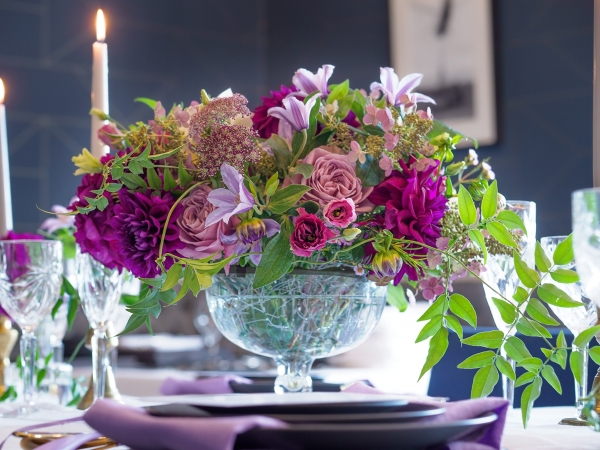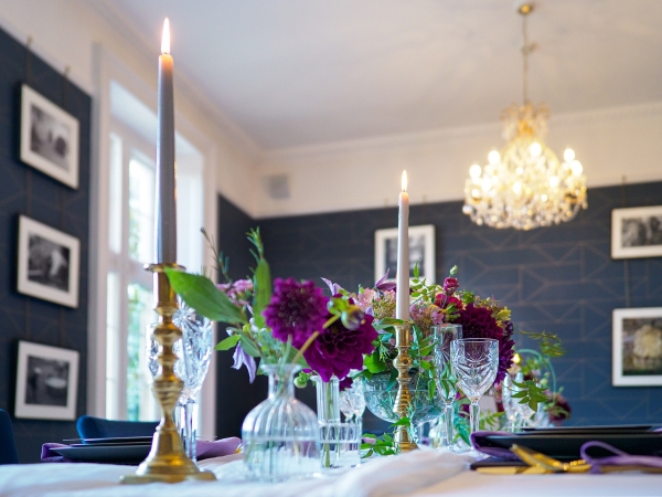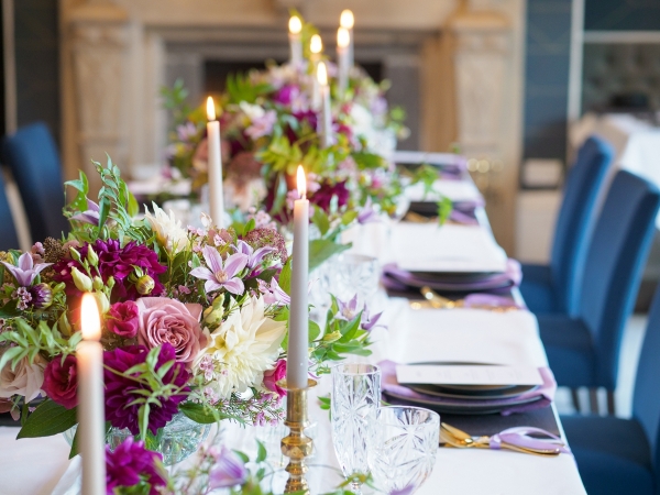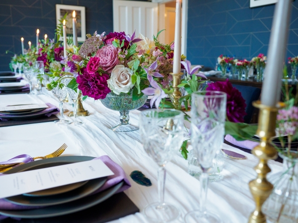 Taking a purple palette mixed with metallic detail including the crockery and candle holders, the tabletops are adorned with vintage accessories and decadently dark tableware that contrasts with the colourful floral arrangements in eye-catching glassware.
