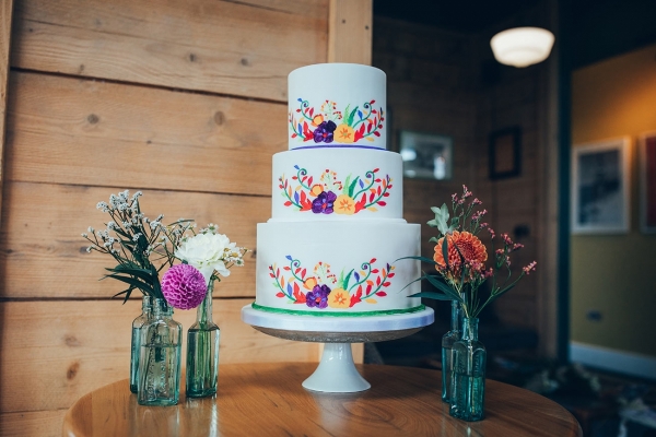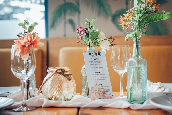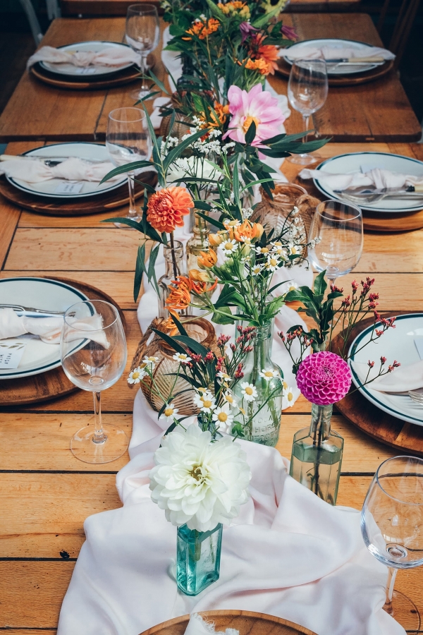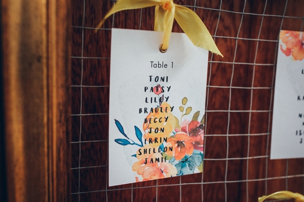 'We used lots of natural light, natural textures and candlelight to create a laid-back, boho feel,' she explains. Bright corals and sea blues bring an effervescence of colour to the stationery, a floral watercolour design adding to the playful mood. Hand-painted flowers add a pretty splash of colour to the crisp white cake, while mismatched vintage bottles filled with bright blooms enhance the bohemian mood with their fresh-from-the-hedgerow aesthetic.