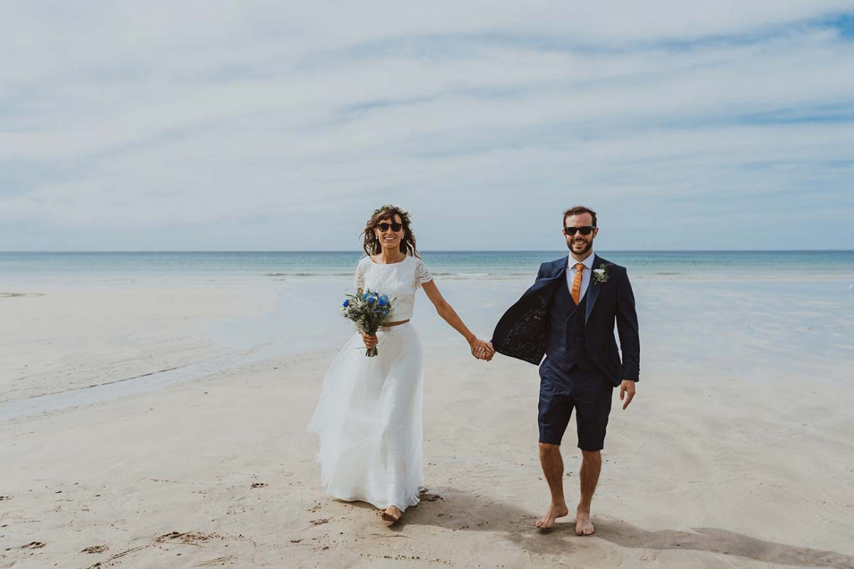 Continuing the sea theme for their wedding, the pair planned a beach party at Lusty Glaze, with ocean-inspired décor to match. Watercoloured bridesmaid skirts, blue and white florals, mussel shell illustrations on the stationery and varnished mussel shells on the cake all contributed to the beautiful coastal design.