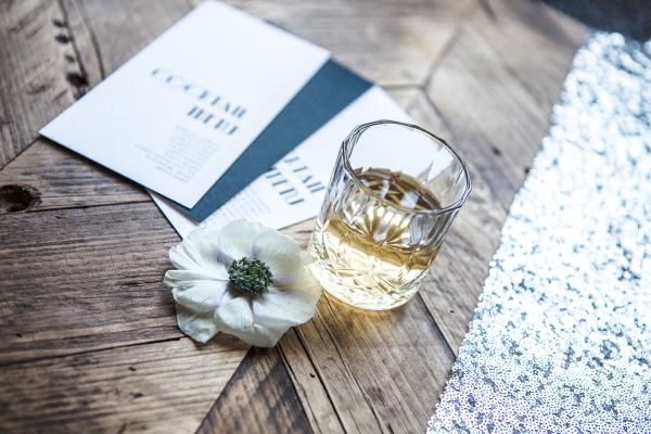 Elegance pervades throughout the styling, from the lace-edged vintage gown to the cut-glass whisky decanter sitting atop a dark oak bar table. The opulence of the Jazz Age provides inspiration for touches such as the feathered headpiece, the tiered cake embellished with gems and silver accents, and props such as the globe bar and gramophone.