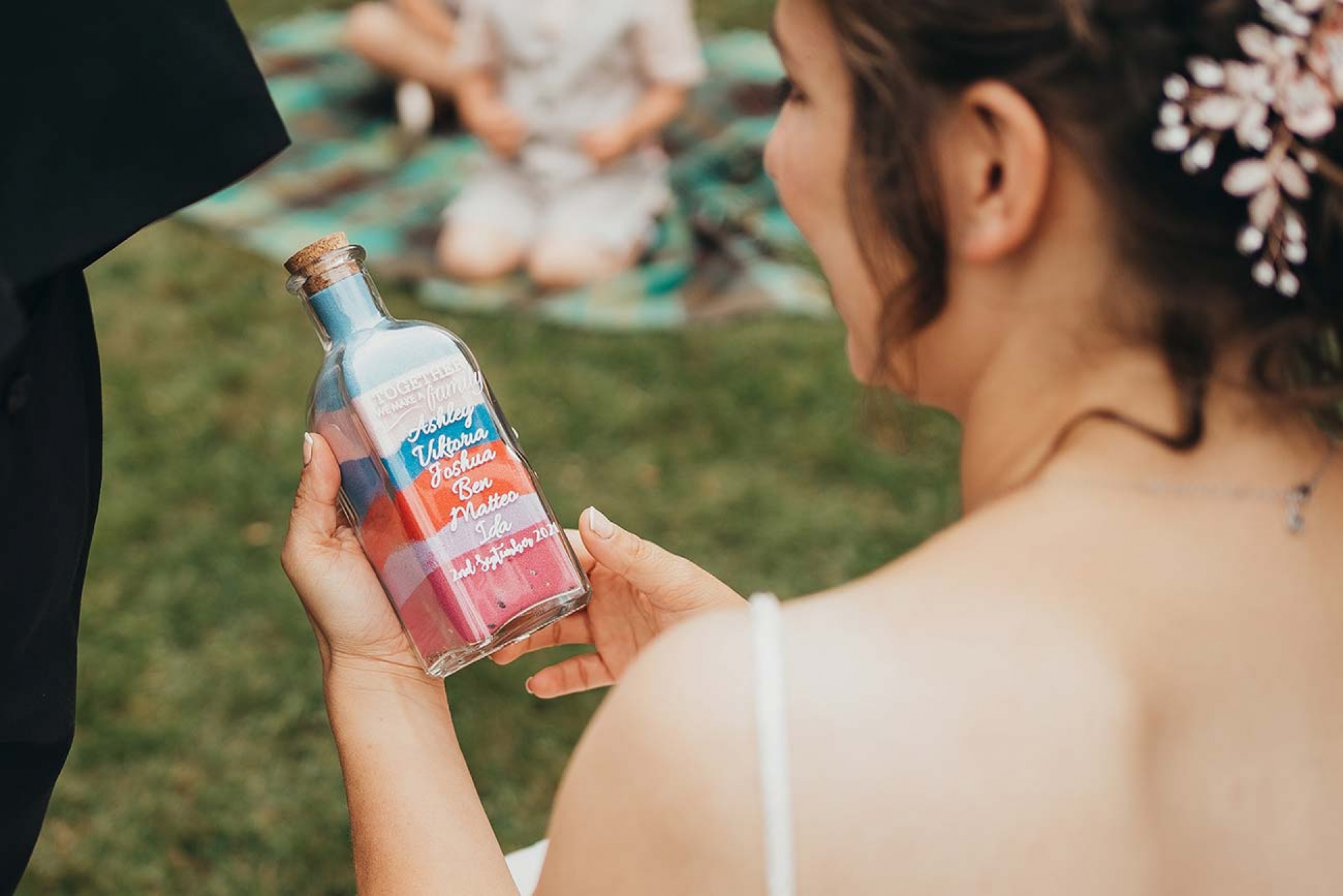A sand ceremony is a beautiful way to demonstrate the coming together of the individual members of the family to create a new blended family. It not only symbolises the unity of the couple, but also the unity of their children. By joining together, the different coloured sands into a vessel of choice, it symbolises that every member of the family has significance. Another meaningful gesture could be matching