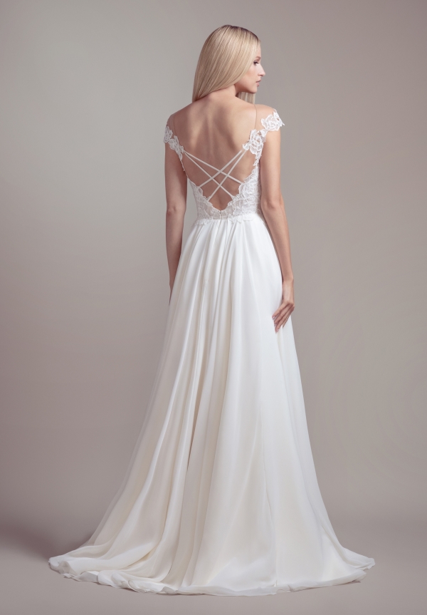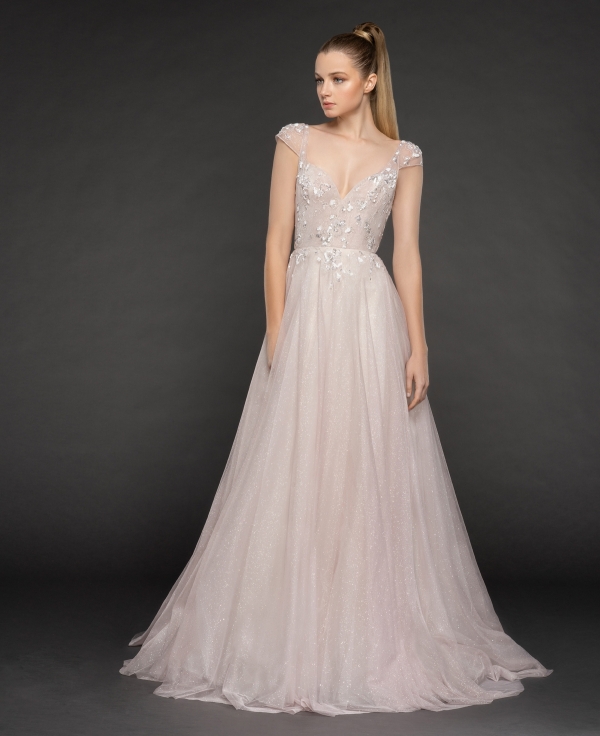 A collection replete with on-trend show-stoppers, there's one in particular that resonates wedding world's current preoccupation with the fairy-tale: Amour - a French lilac starlight tulle A-line gown comprising an embroidered cap sleeve bodice with sweetheart neckline and low scoop back. Wow, indeed...