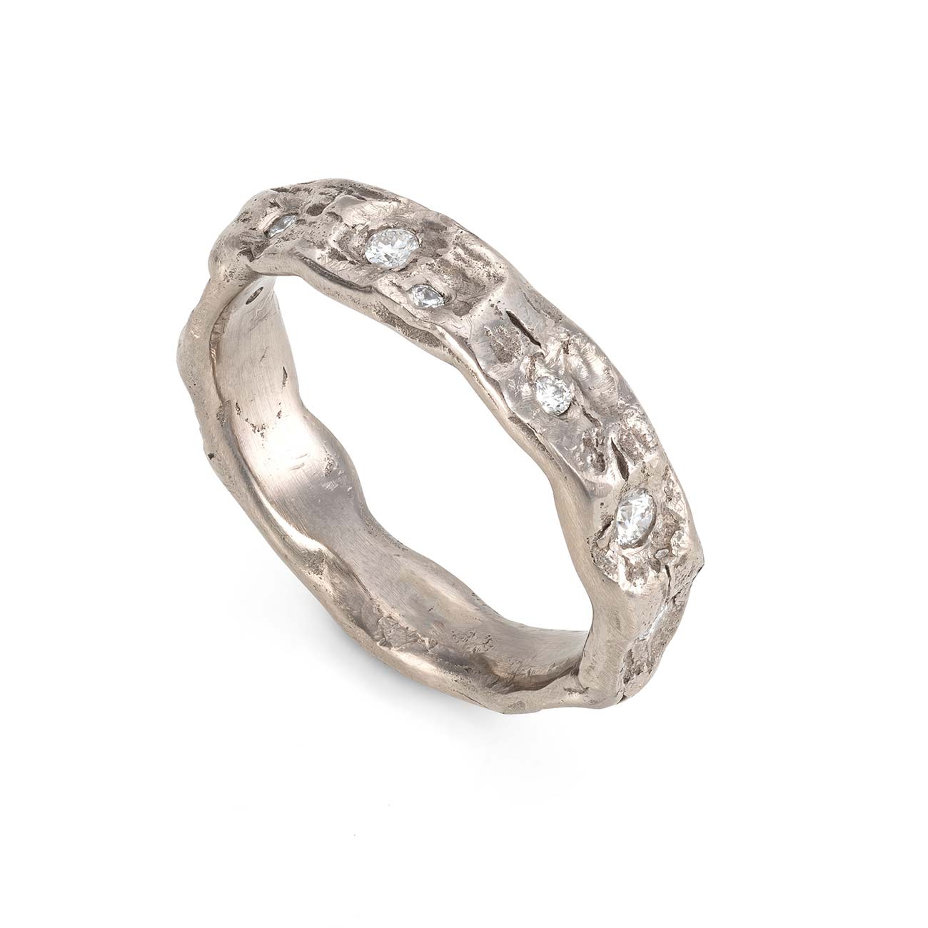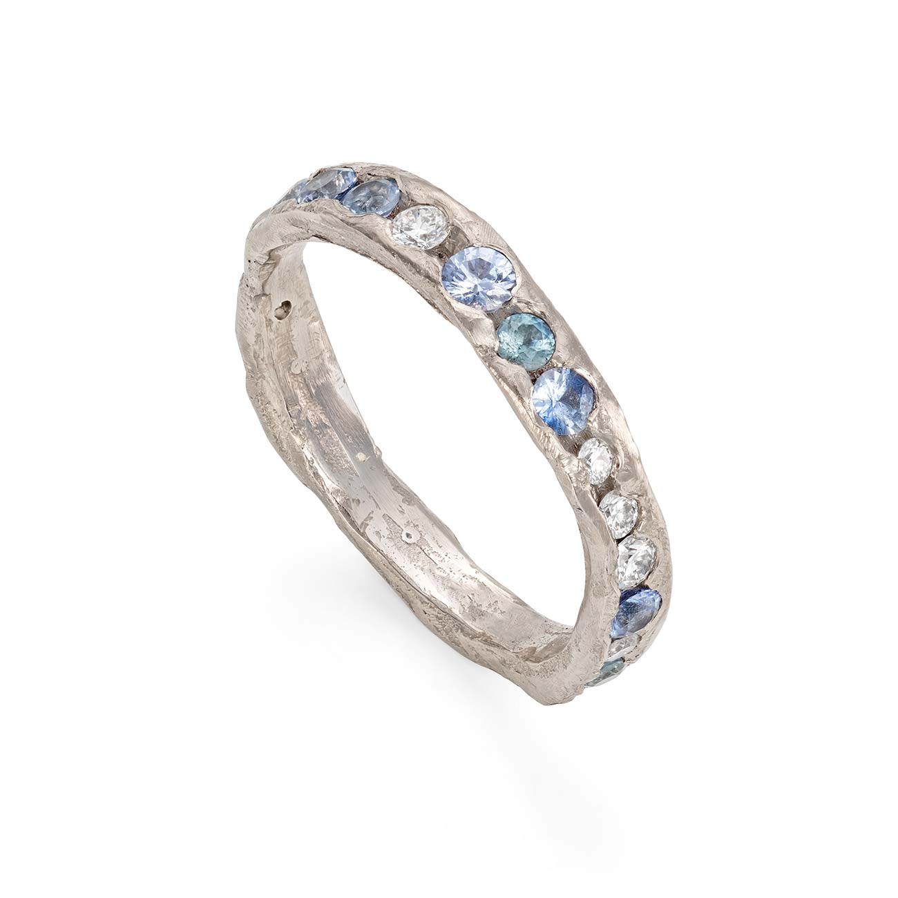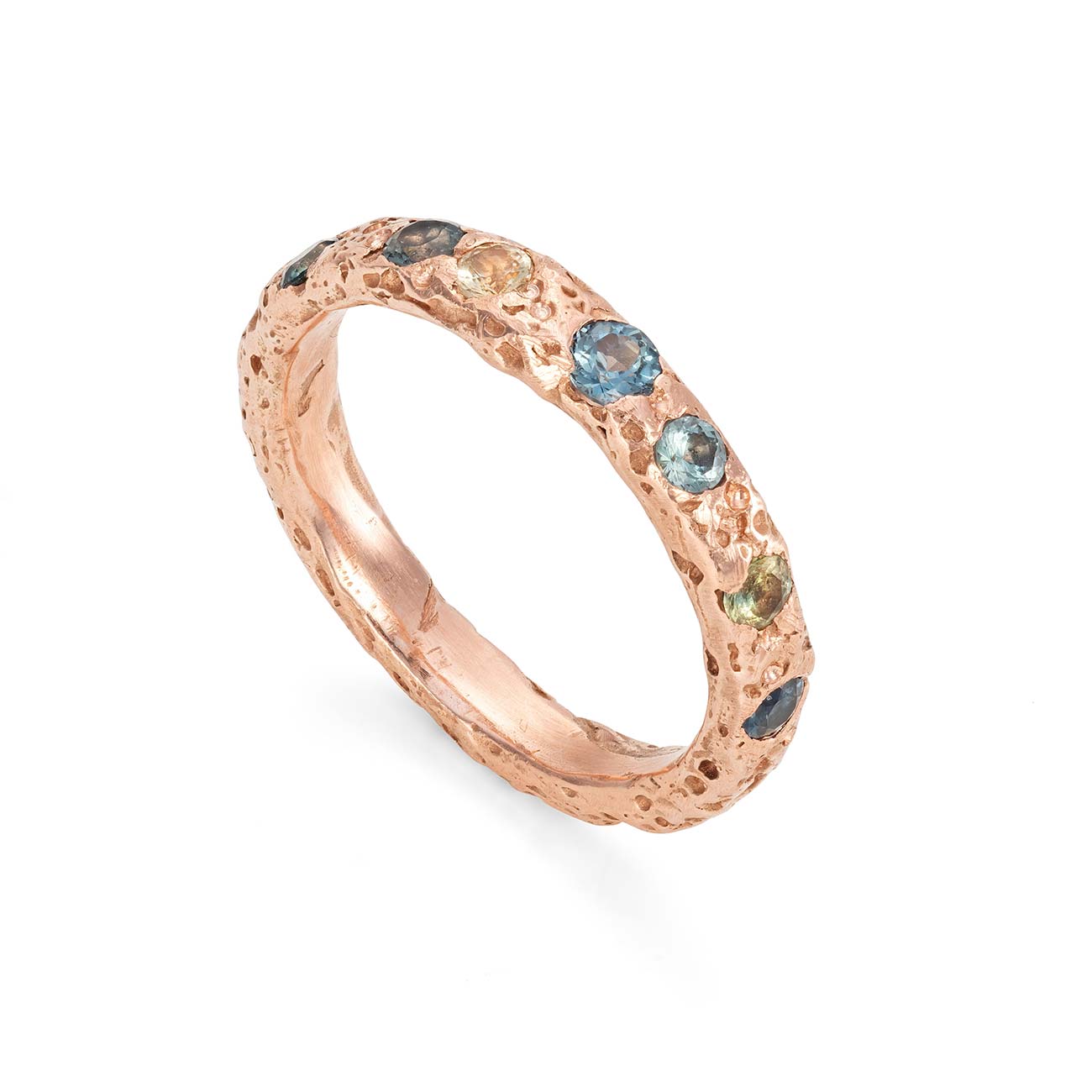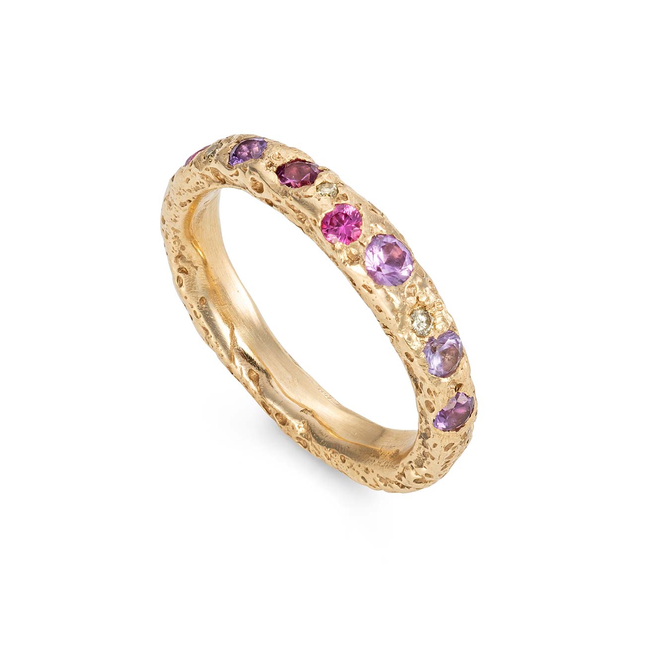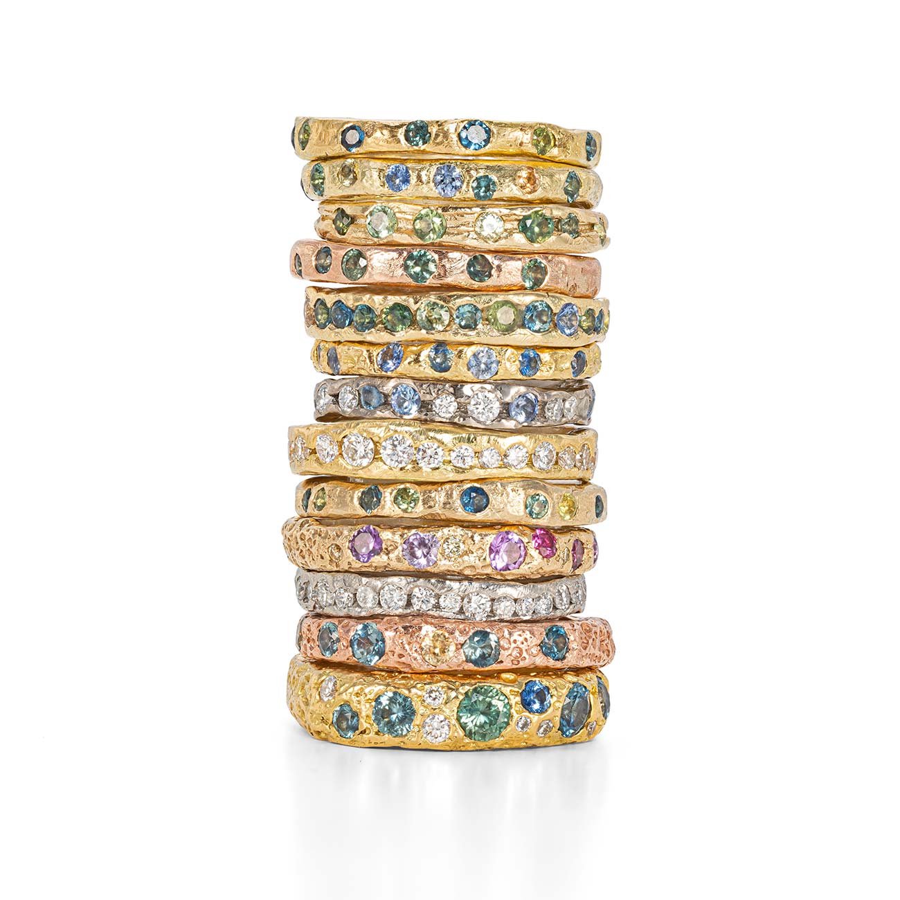 Continually adding to her exquisite collection and experimenting with new forms, these latest creations make for dazzling wedding bands. The distinctive textures of sea urchins and weathered rock meet a glorious carnival of sapphires in shades of blue, teal and green through to bold pink and purple, making for a standout symbol of your love of each other – and the sea.