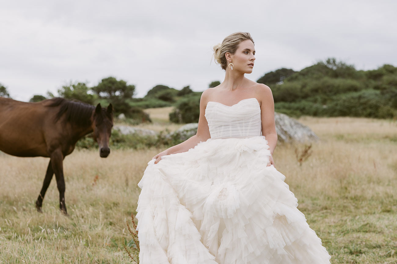 Our bridal fashion story Unbridled Spirit sets the coolly individual mood with its showcase of fashion-forward gowns and separates, perfect for a relaxed and wildly romantic wedding in the Cornish landscape. The natural beauty and away-from-it-all vibe – and rather photogenic horses – of new wedding venue Lower Bussow Farm in St Ives provided a breathtaking backdrop.