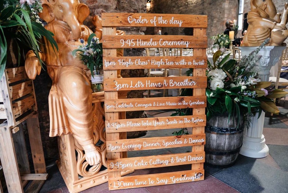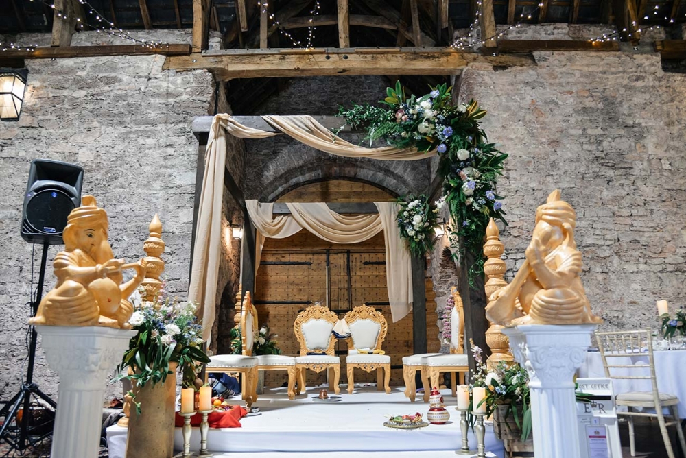 'It was important for us to reflect both cultures throughout the day,' says Dipty. 'For the Hindu ceremony there was a heavy presence of 'English country garden' throughout the barn.' Handmade crates and chimney pots were filled with Devon grown flowers, while the mandap was covered in blooms including clematis, peonies, magnolia tuberose, eryngium and astilbe.