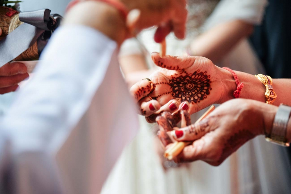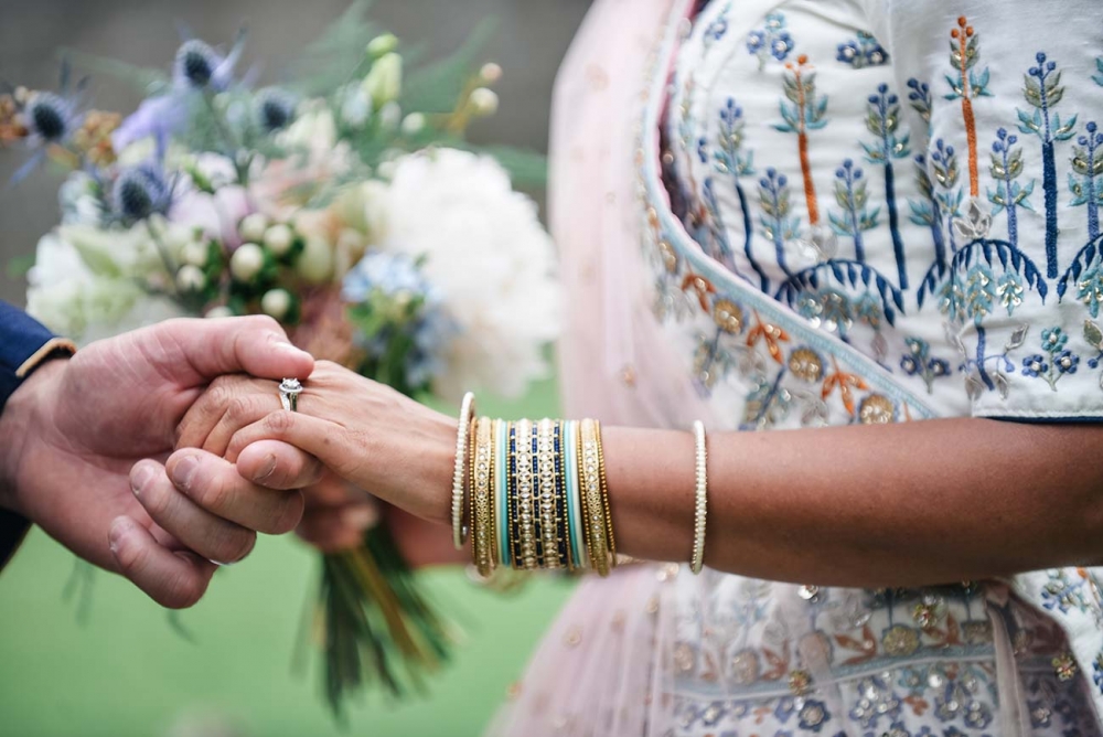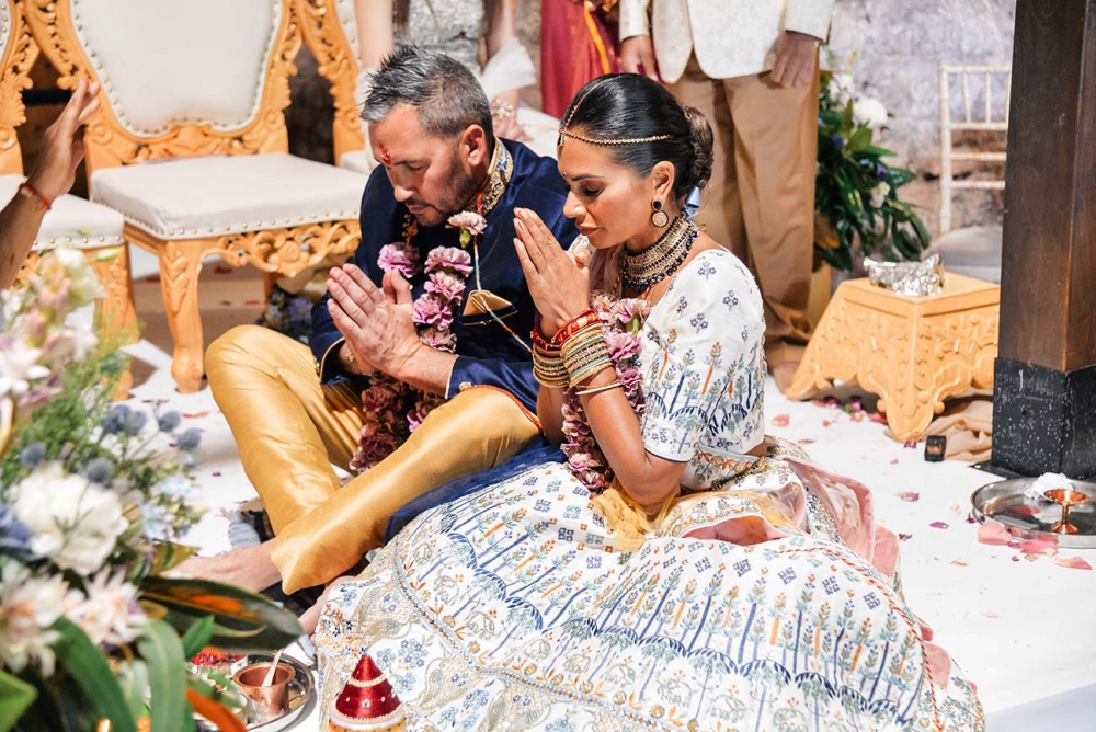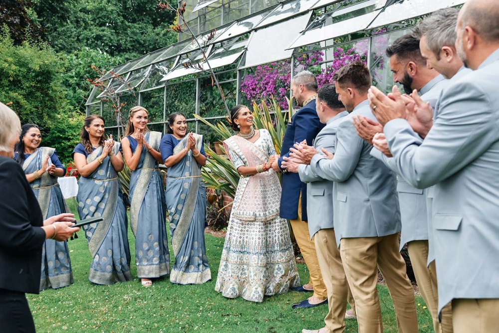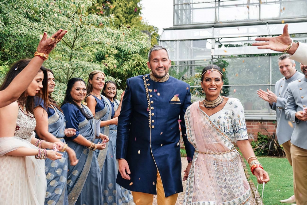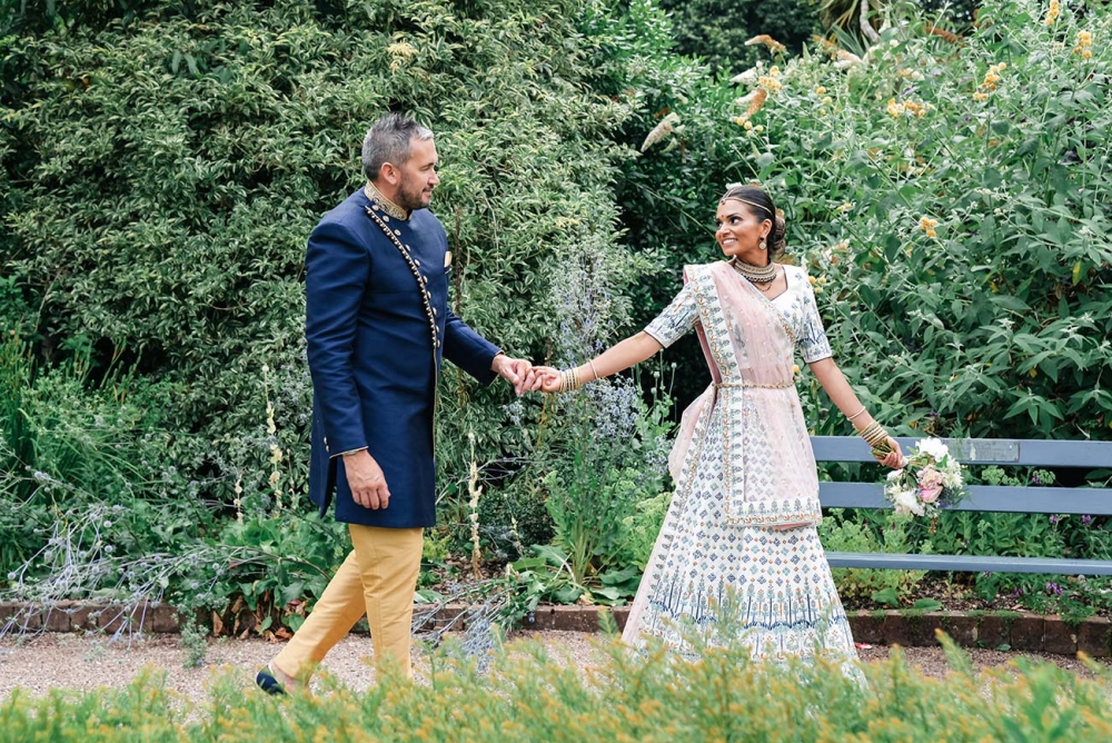 Their 'east meets west' wedding took place in several parts, firstly with a Hindu wedding ceremony in the 16th century Spanish Barn followed by an intimate civil ceremony in the grounds surrounding the Palm House.