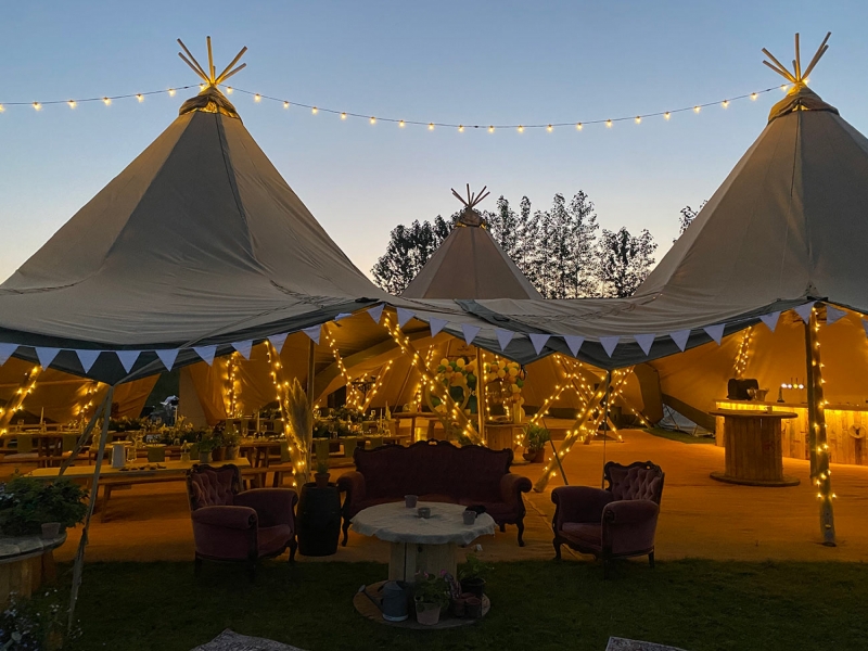 Tailored entirely to your vision, you might stage a blessing overlooking the rural panoramas before celebrating with your nearest and dearest, or take your vows elsewhere before relocating to your tipi reception and feasting with up to 150 guests in attendance. The tipis come fully furnished complete with a handcrafted wooden bar; bedecked in festoon lighting, fairy lights and a lantern lit walkway, you're assured a palpably magical ambience as night falls.