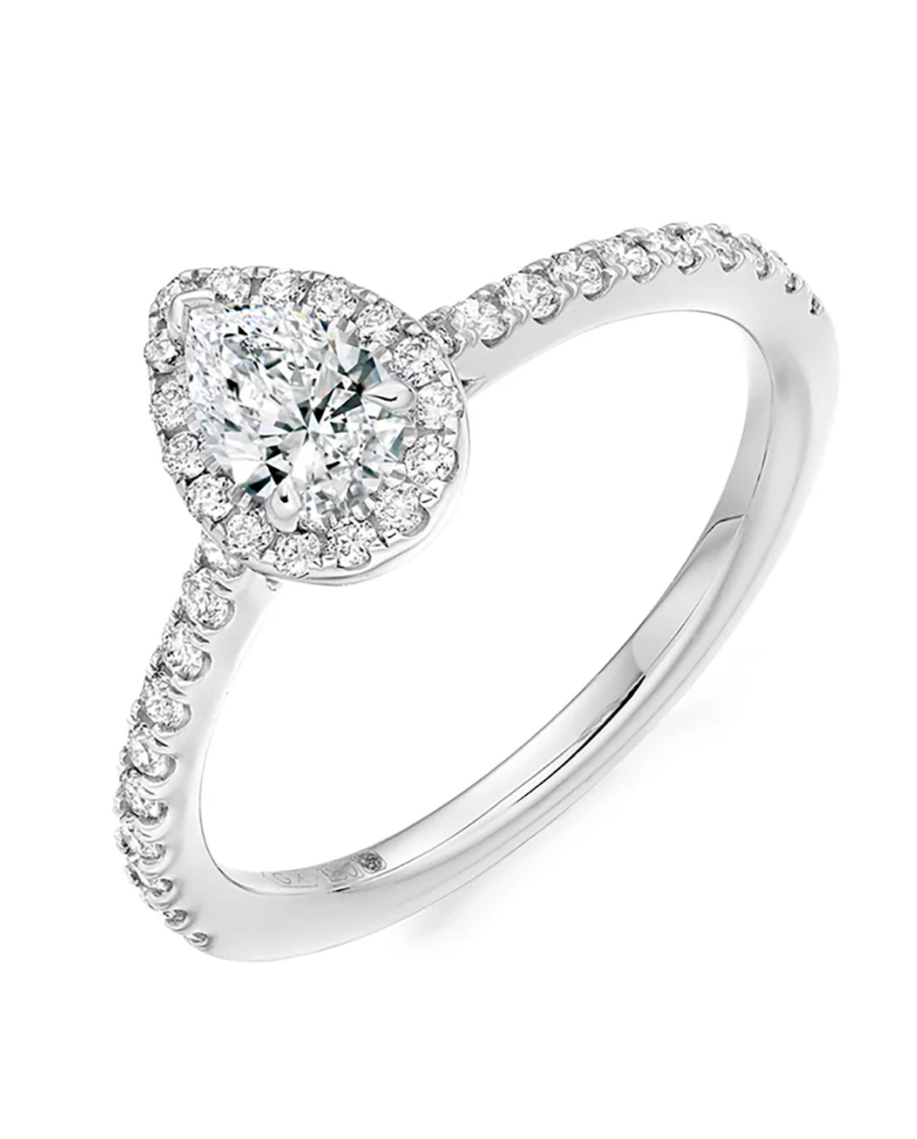 “The pear-cut shape offers an elegant point on the hand, whilst the encapsulating halo of diamonds amplifies the diamond's presence. It is truly a stunning engagement ring choice!” Katie, Truro.