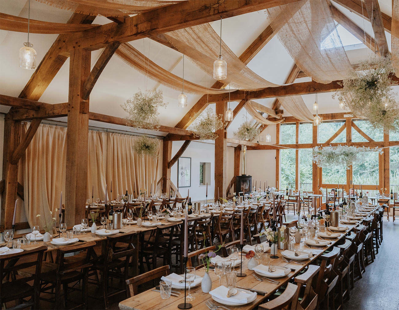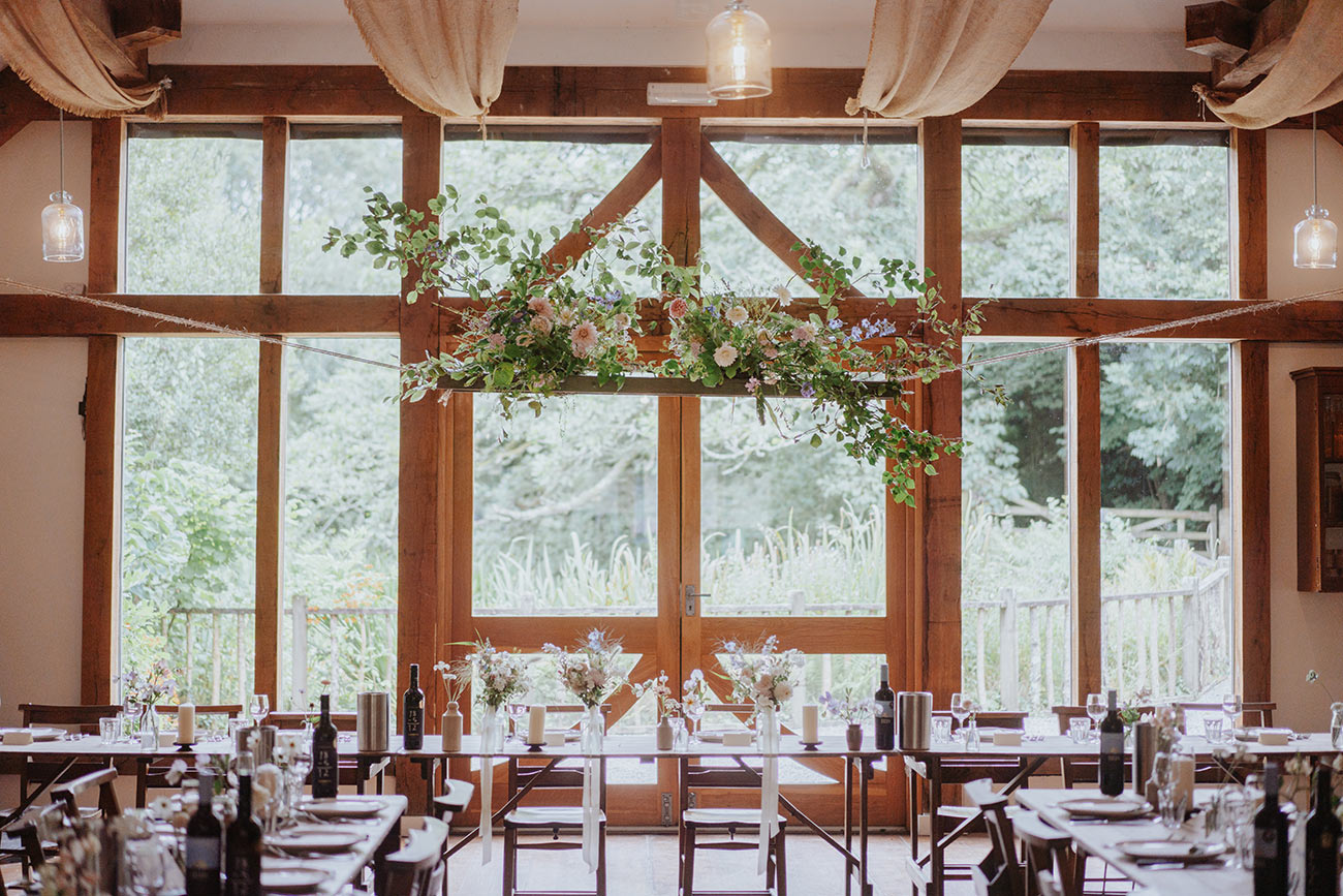 Imagine a summer wedding, surrounded by fresh scents and vibrant colours of blooming flowers and herbs, with plenty of outdoor space to enjoy the sunshine or take a peaceful stroll by the idyllic millpond. Or embrace the cosy autumnal charm, with roaring wood-burners, firepits in the flower-filled courtyard and a candlelit feast in the atmospheric barns.