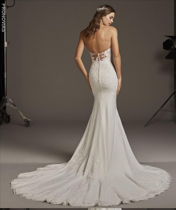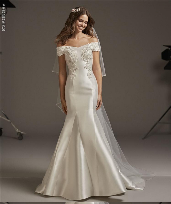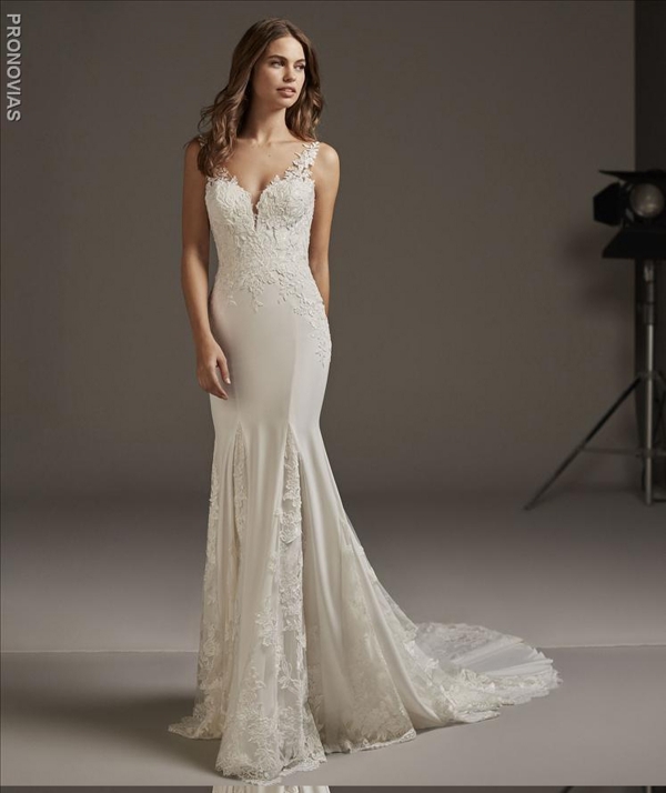 Hot off the catwalk, Pronovias' latest dresses ooze modern romance, combining vintage-like looks with haute couture to entrancing effect. Form fitting styles such as elegant mermaids feature standout elements tattoo-effect straps, lace illusion panels and floral embroidery, while Editor's Pick 'Phoebe' is a glorious Mikado gown complete with beaded chest panel and strapless neckline.