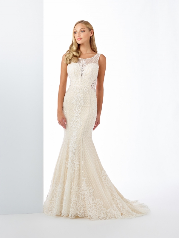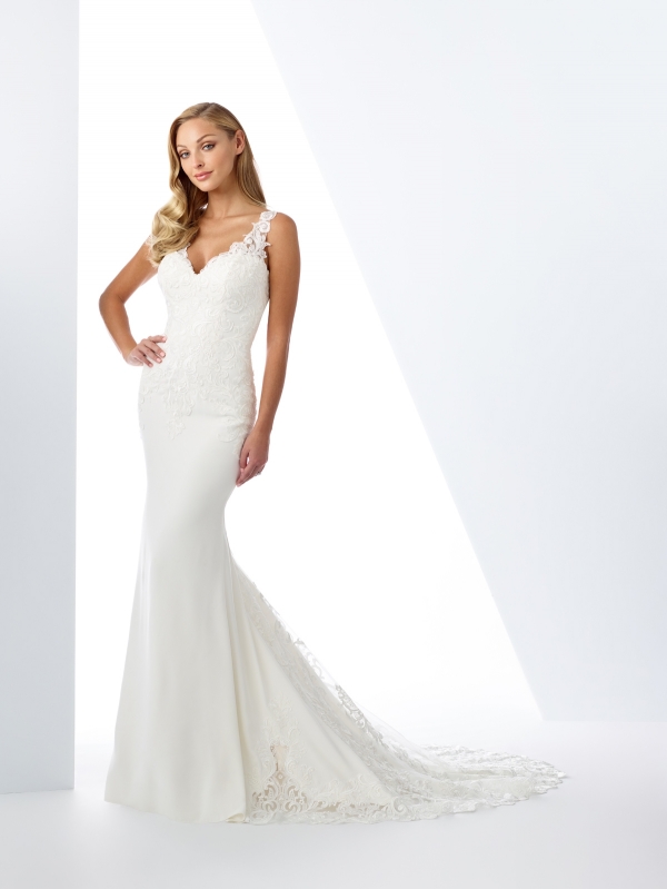 It's a spoilsome selection, from stretch satin crepe to mermaids with ruffles and A-lines with high scoop sheer illusion necklines, or runway spectacular 'Marnie' - a classic trumpet gown with deep-V neckline and sheer peekaboo and sheer lace halter strap. Created from soft tulle and organza embellished with hand beaded lace appliques, it offers a corset back and a chapel train trimmed with lightly beaded opulent hem lace.