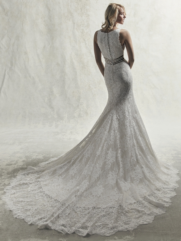 Then there's Sottero & Midgley, with delicate lace motifs woven into show-stopping fit-and-flare frocks replete with eye-catching detail, including one of the stars of the show, Sloane, a stunning sheath featuring a gorgeous jewel neckline, illusion plunge and waistline and pearl buttons.