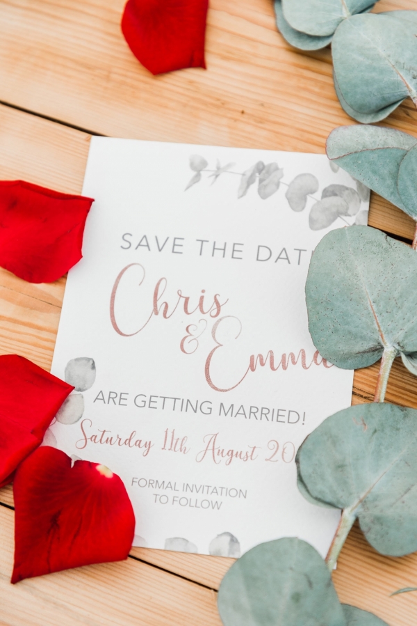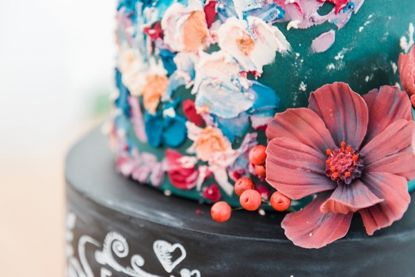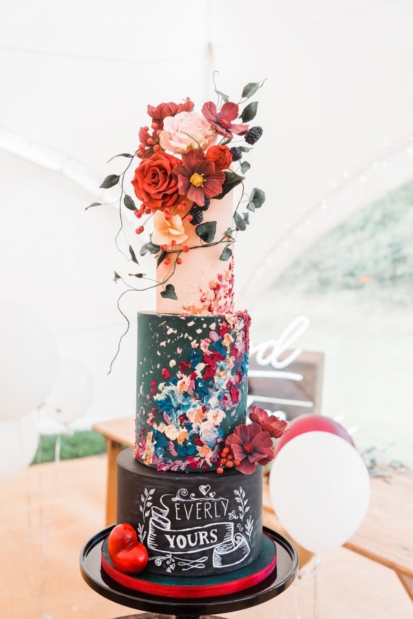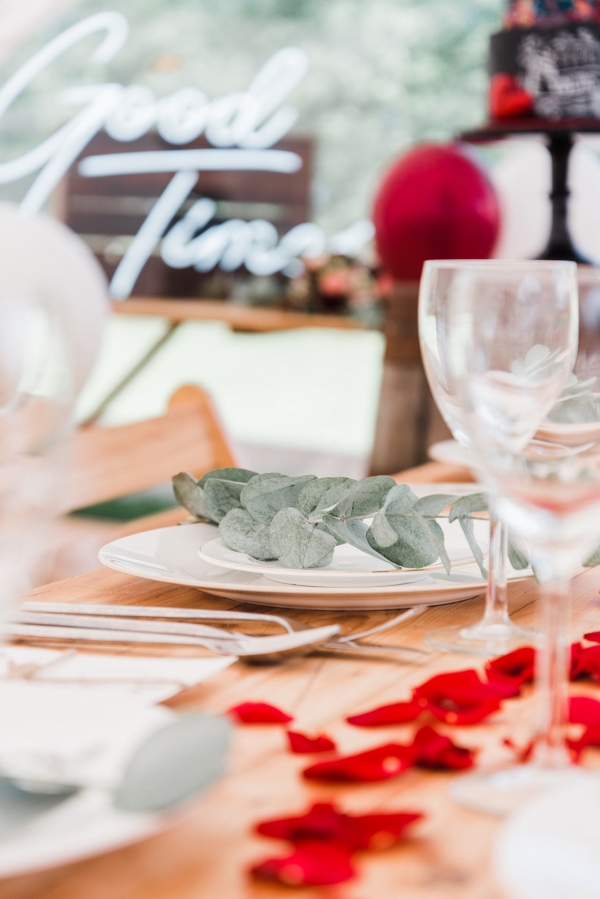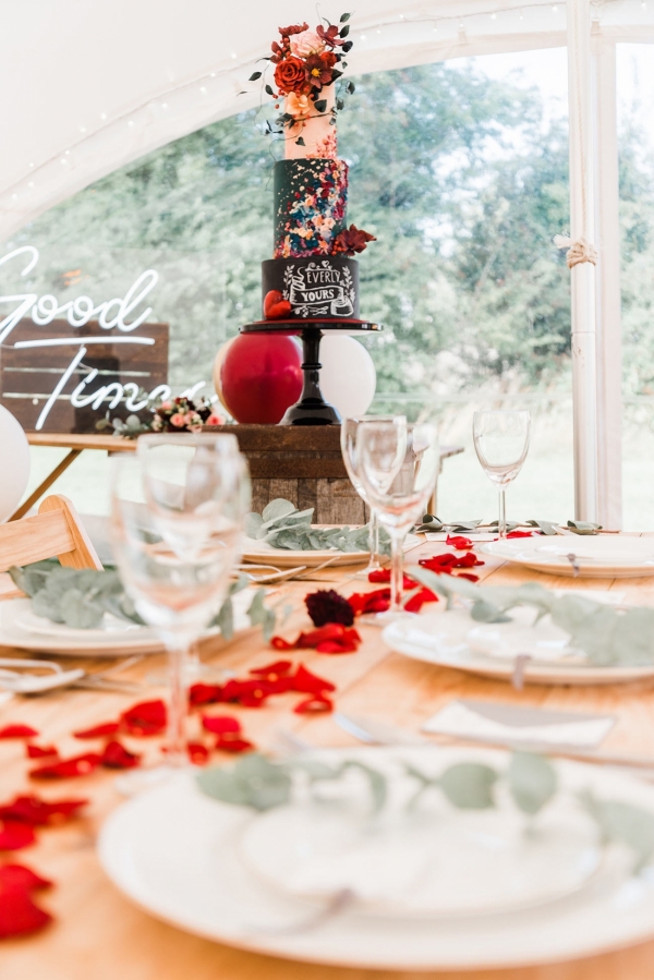 The hand-painted cake is a colourful masterpiece, artful in its design and unique with its hand-written message of long-lasting love. Eucalyptus leaves, foliage and red petals bring colour to the table styling, while balloons and neon lighting add to the fun factor.