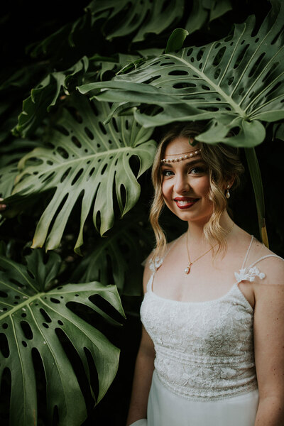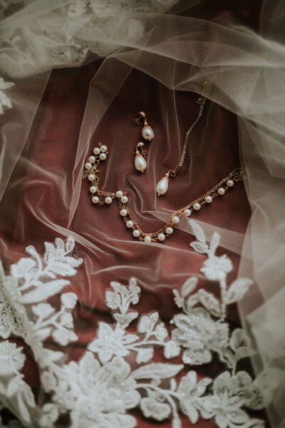 The bridal styling is just as striking: a form-skimming gown with a delicately beaded bodice and sweeping skirt, teamed with a cape for added drama. Elegant pearl jewellery, a handmade head chain and lace boots add texture and charm, complemented by a sleek, wavy updo. “The look was completed with a signature autumnal red lip, setting a statement of bold refinement,” says Hannah.