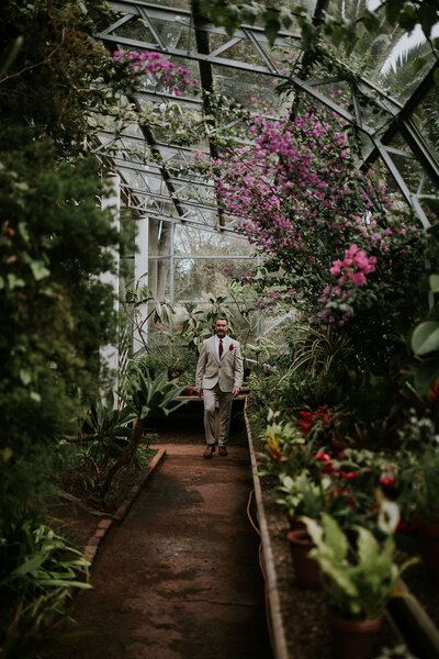Refined, sensory details shape the mood. In the Undercroft, chalky stone walls cocoon an intimate ceremony scene dressed with soft draping, sculptural florals and candlelight – timeless, atmospheric and achingly romantic. The Ballroom, meanwhile, becomes a vision of opulence, where deep-red and white linens, beaded gold charger plates, crystal glassware and clusters of candles adorn the tabletops. A hand-painted cake nods to the art in the galleries, where the newlyweds wander through to the Palm House – lush with waxy palms and a carnival of vibrant blooms.