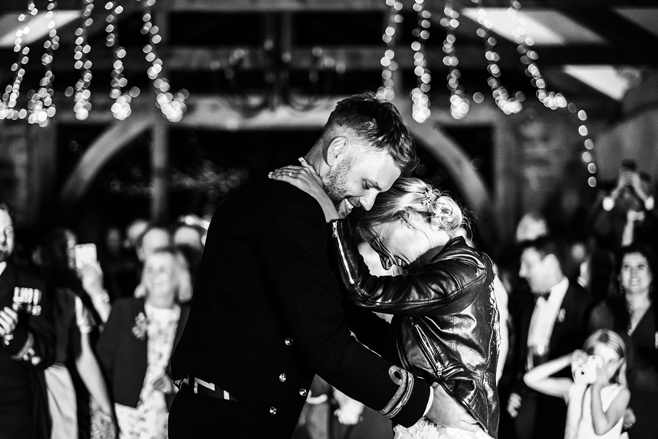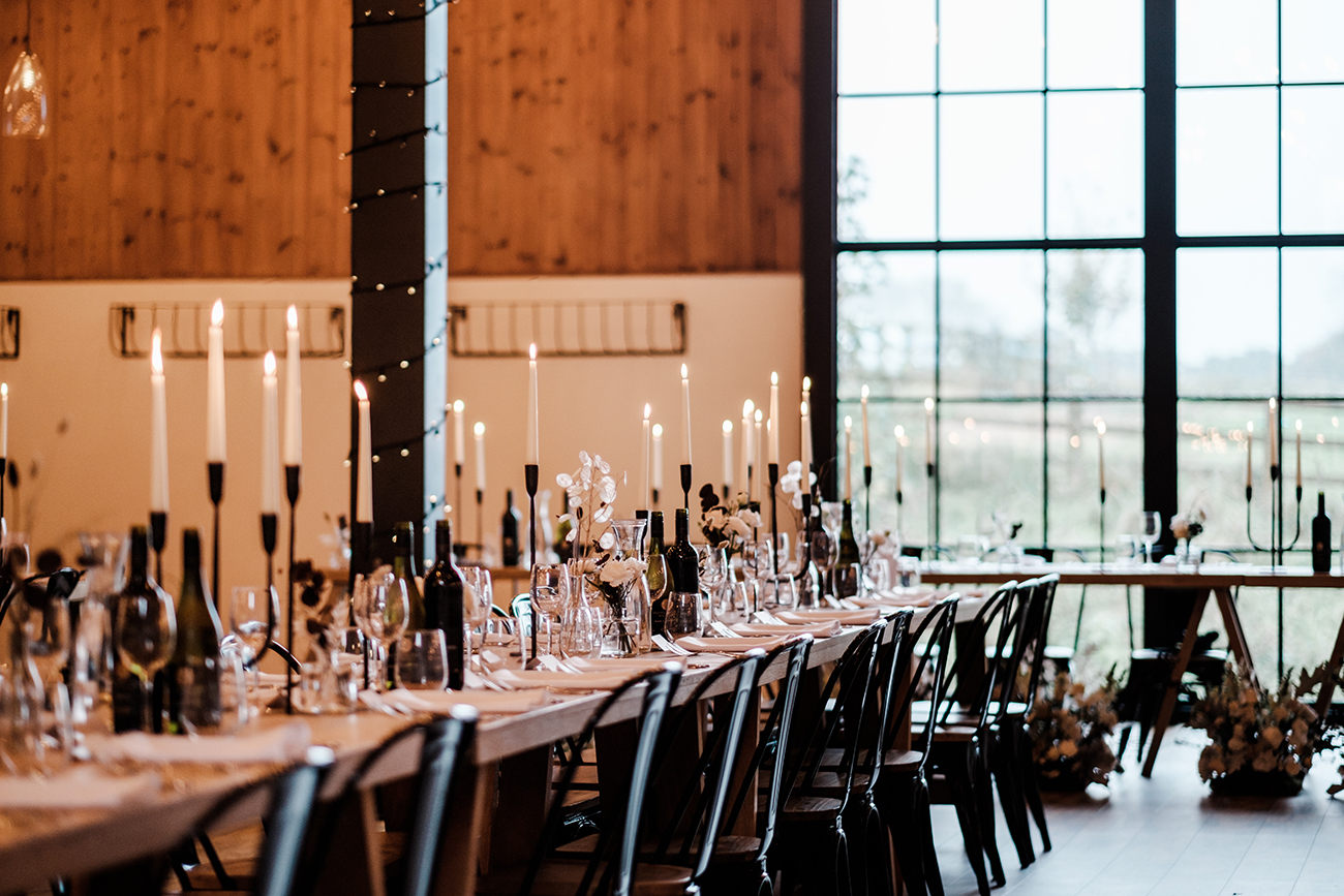 Flowers brought a dreamy softness to the look of the day. “Lunaria was the main flower – it’s also called honesty which is perfect symbolism for a wedding,” she says. “As it’s a dried flower, I wanted a mixture of dried and fresh flowers that looked natural and organic in shape.” A stunning display featuring lunaria, gypsophila and roses made a picture-perfect backdrop for the couple to take their vows, while tables topped with pared-back florals and matt black candelabras complemented the industrial look of the Stable Barn.