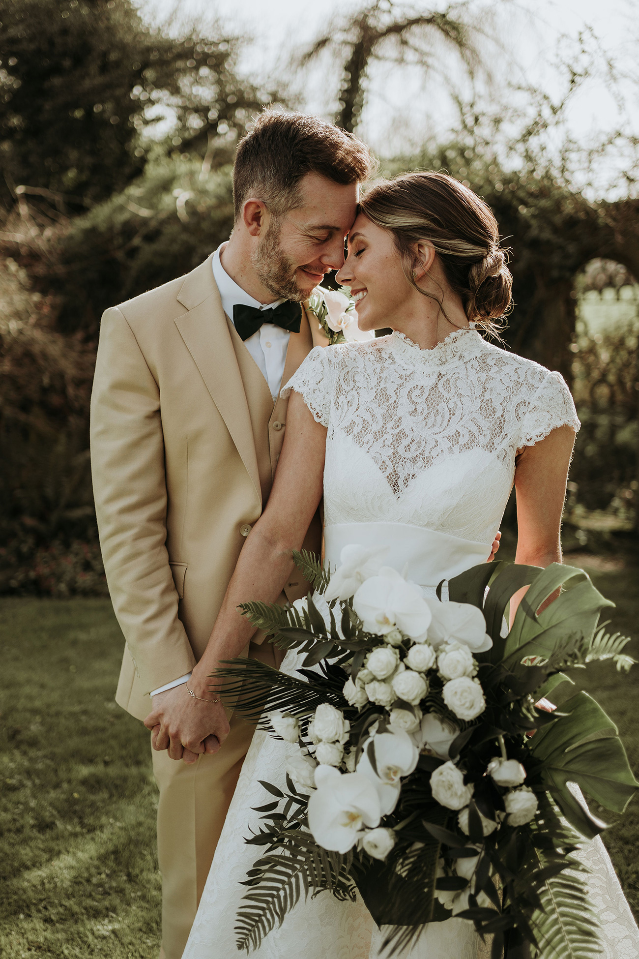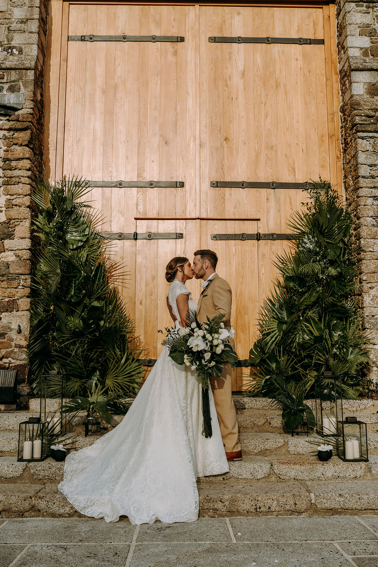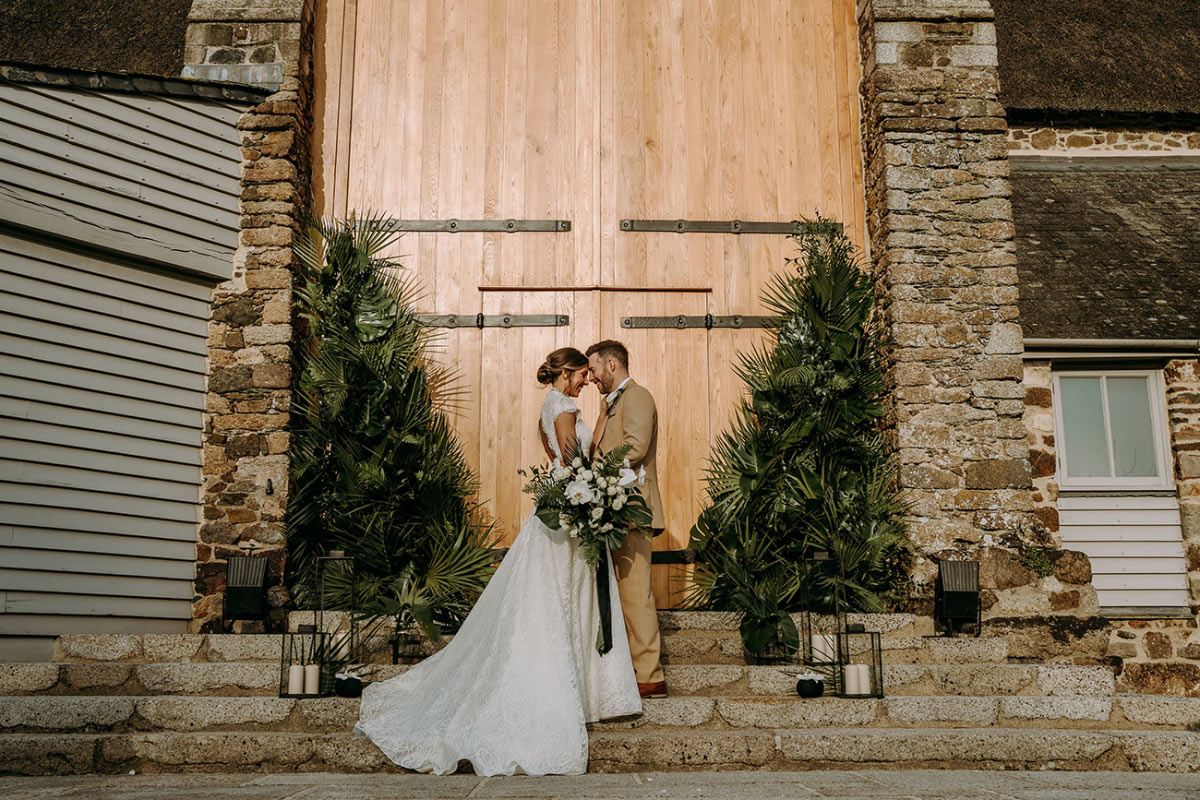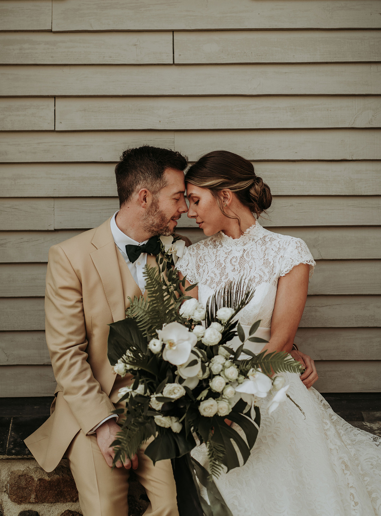 Paired with a bouquet combining clusters of orchids and roses framed by greenery, the dresses exude contemporary elegance, from the delicate lace and cap sleeves to the full skirts. The earthy hue of the groom’s suit, meanwhile, pairs perfectly with the rich textures and tones of the setting, completing a captivating scene in this enchanting rural idyll.