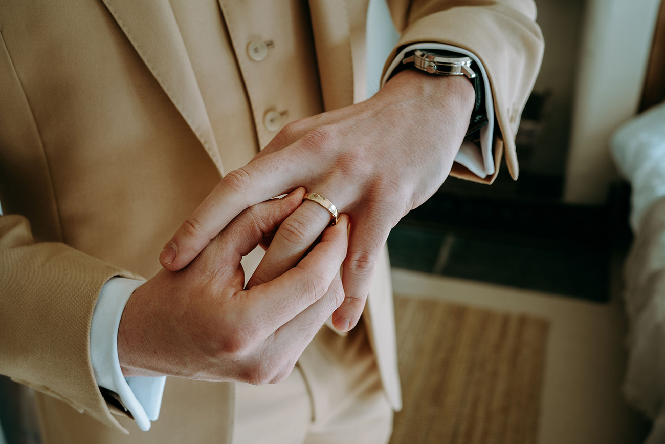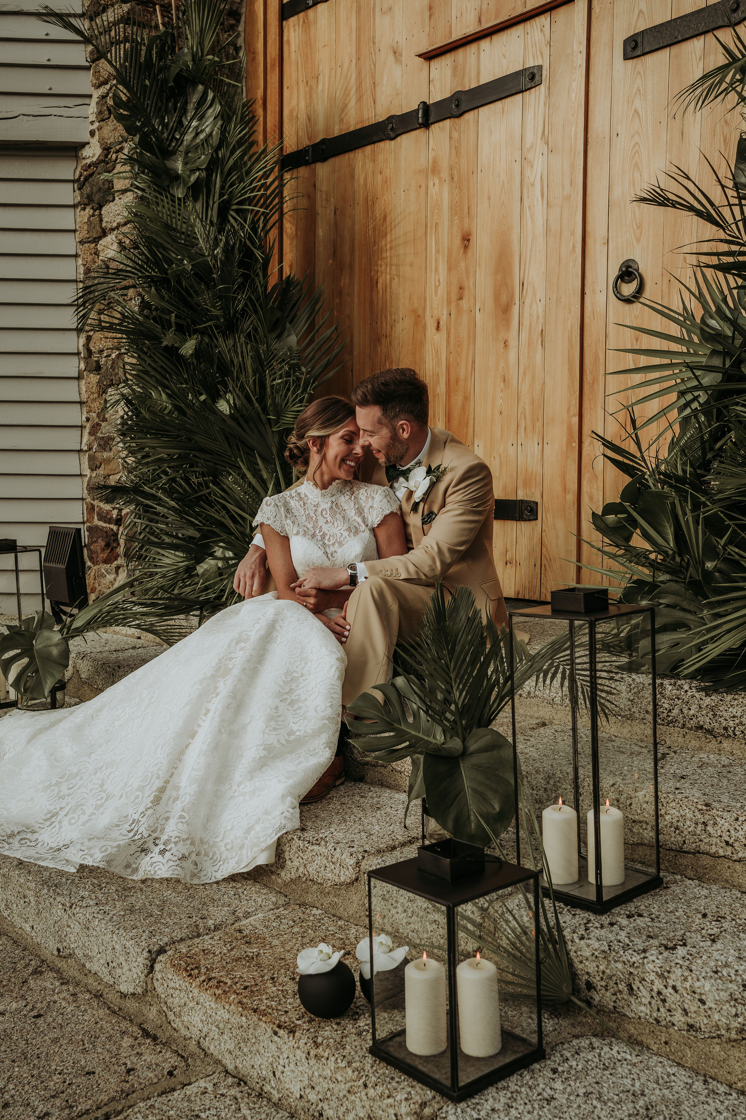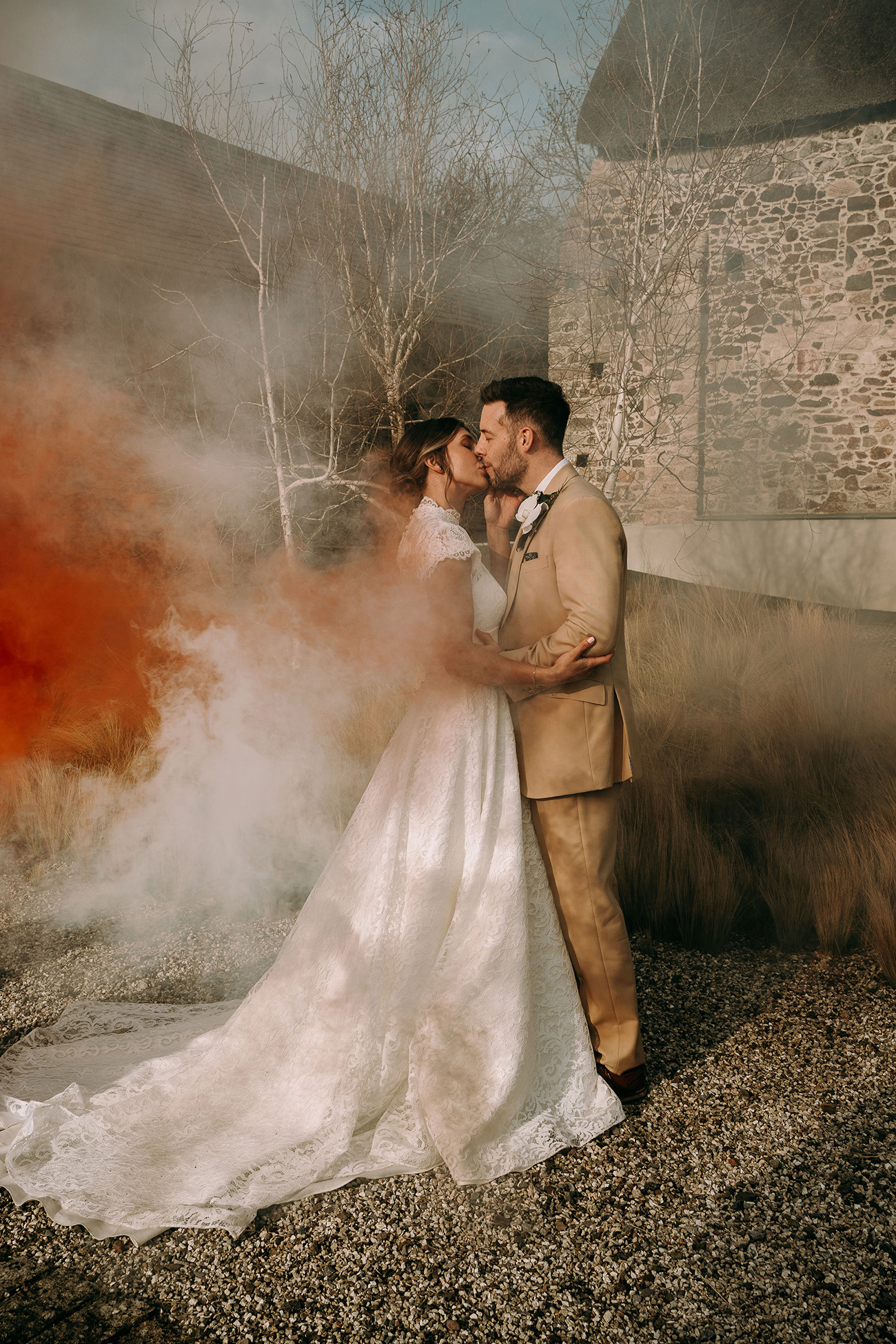 Paired with a bouquet combining clusters of orchids and roses framed by greenery, the dresses exude contemporary elegance, from the delicate lace and cap sleeves to the full skirts. The earthy hue of the groom’s suit, meanwhile, pairs perfectly with the rich textures and tones of the setting, completing a captivating scene in this enchanting rural idyll.