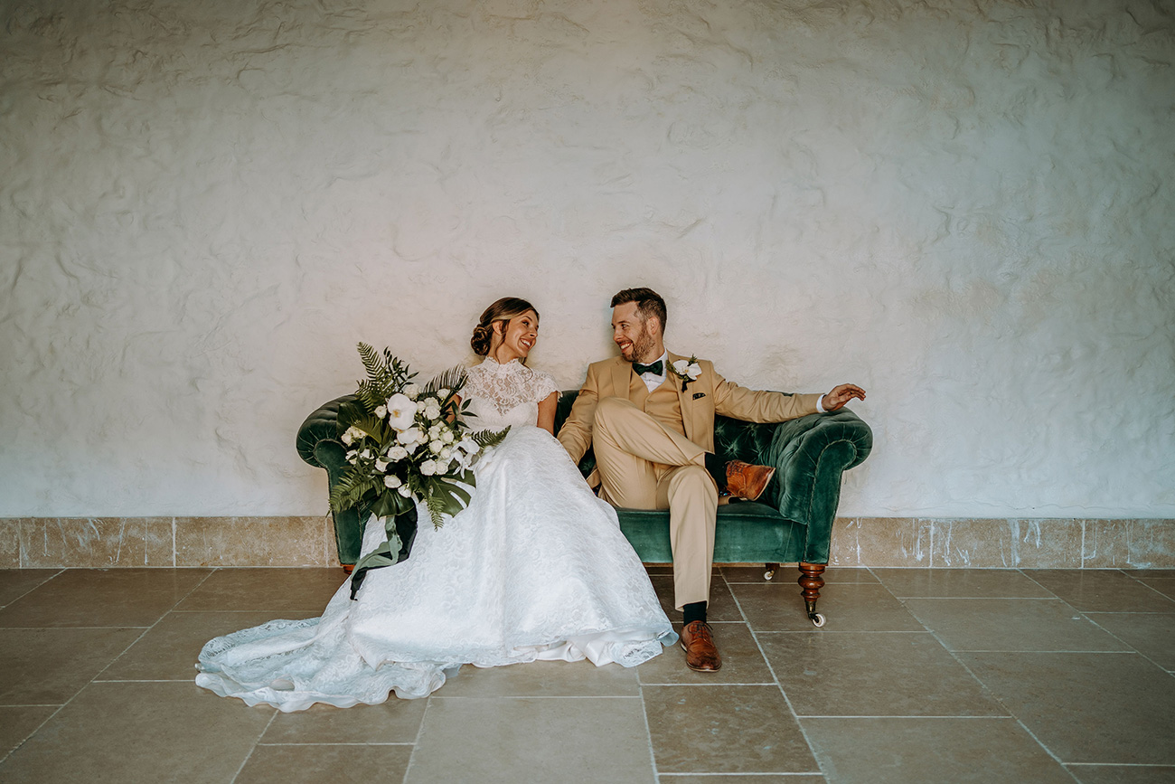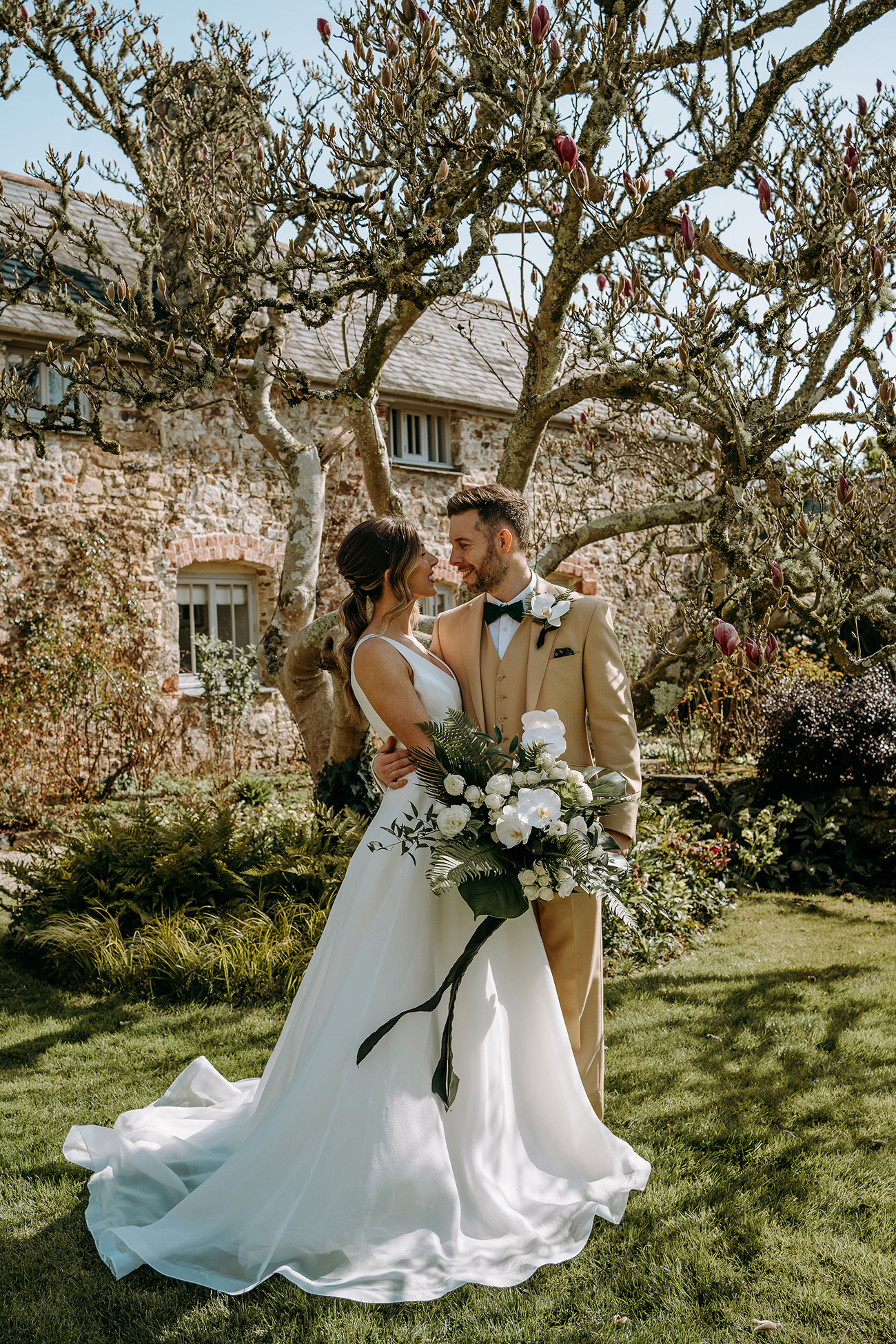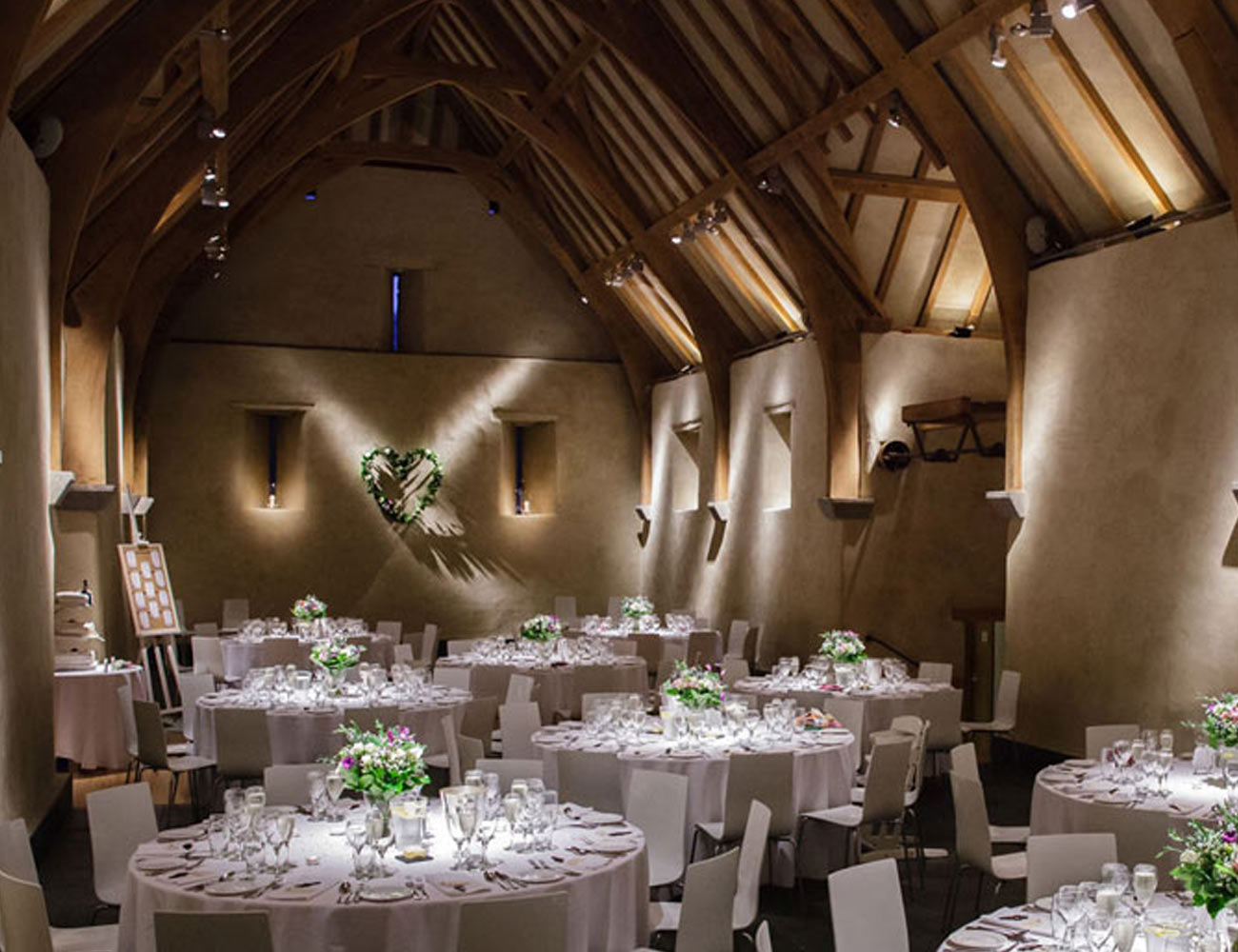 Nestled amidst a leafy valley in a tranquil corner of south Devon, the setting of The Great Barn is nothing short of idyllic. Flanked by a pretty courtyard and picturesque gardens abloom with a carnival of colour in the warmer months, the restored 15th century barn is spectacular on the outside – and breathtakingly beautiful on the inside. The dramatic vaulted ceiling, vast scale and atmospheric lighting make for a stirringly romantic setting for a wedding – and a dream canvas for this modern styled shoot with elegant keynotes.