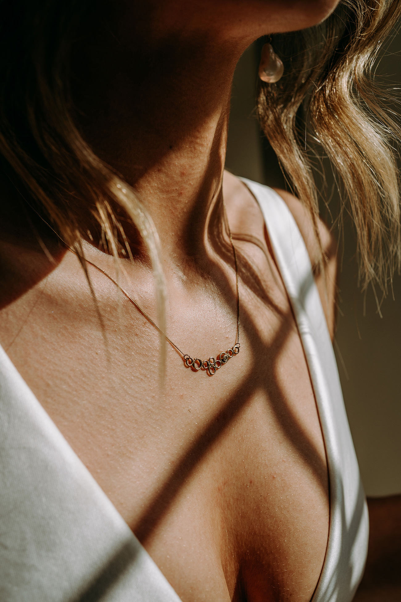The rich combination of textures at the venue also provided inspiration for the details. “I love using different textures and wanted to include a variety through the veil and dresses as well as the fabrics on the table, the charger plates, candlestick holders and rippled wine glasses,” explains Natalie. “The surface of the cake also added to the textural element of the shoot”.
