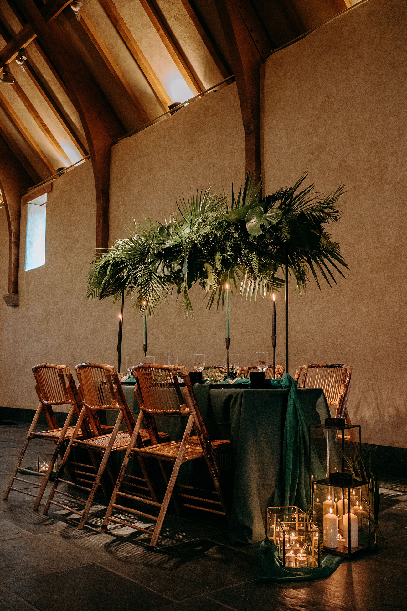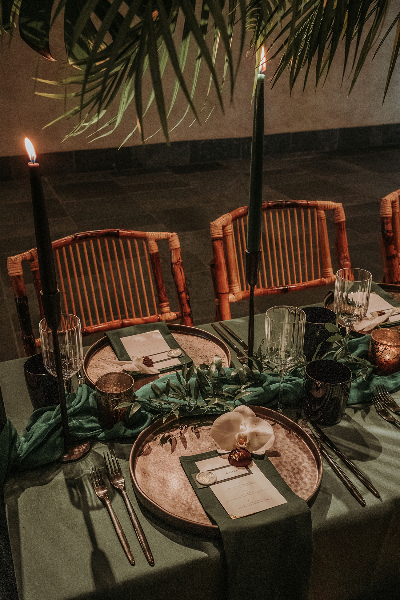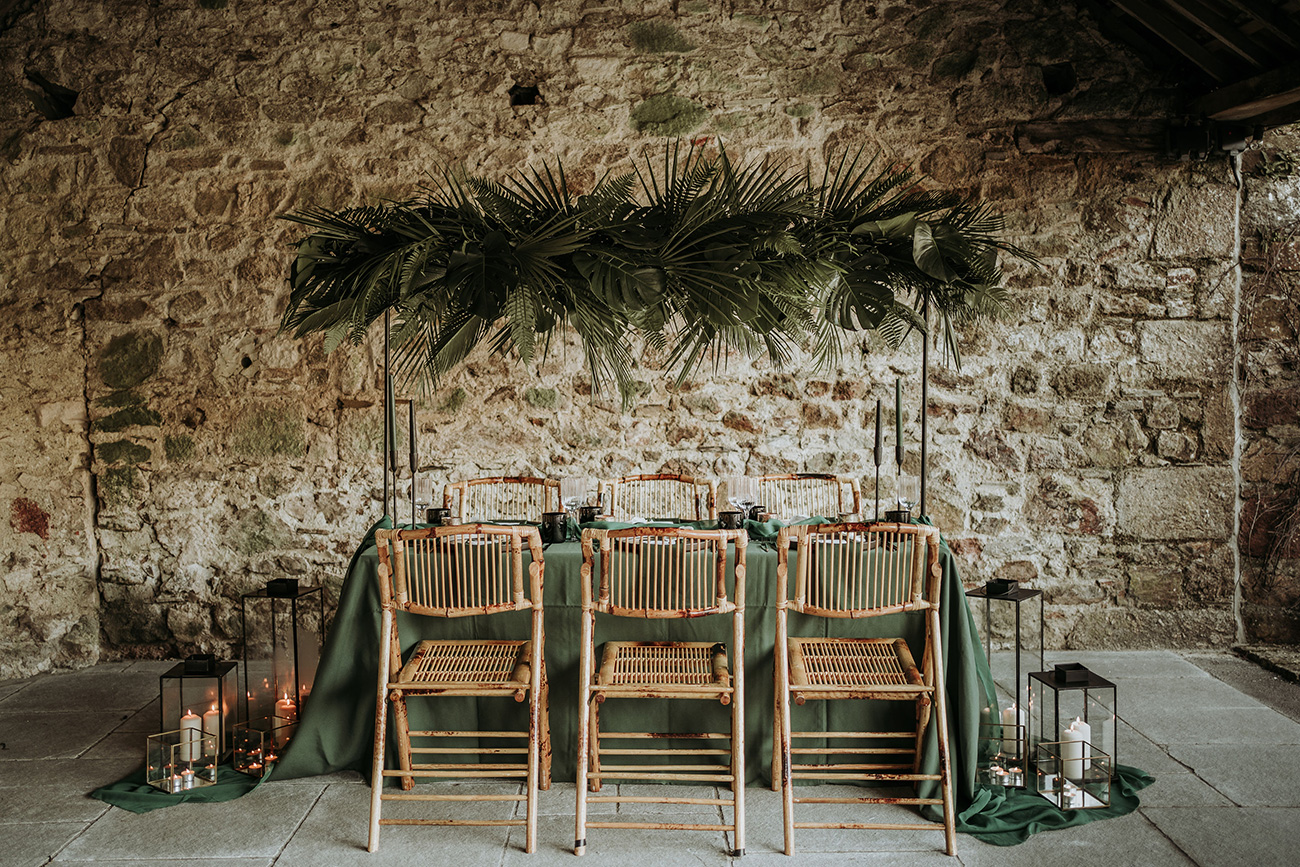 “Using greens as a base colour and layering this up with black and accents of gold made the overall look super modern, illustrating that darker colours can absolutely be used in weddings,” she continues. The waxy green of the monstera leaves and foliage, together with bamboo chairs and orchids, adds an exotic edge.