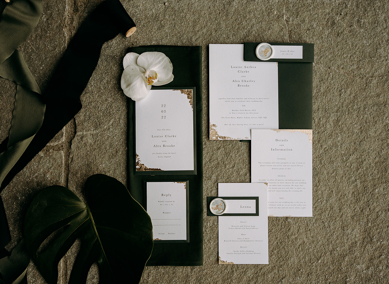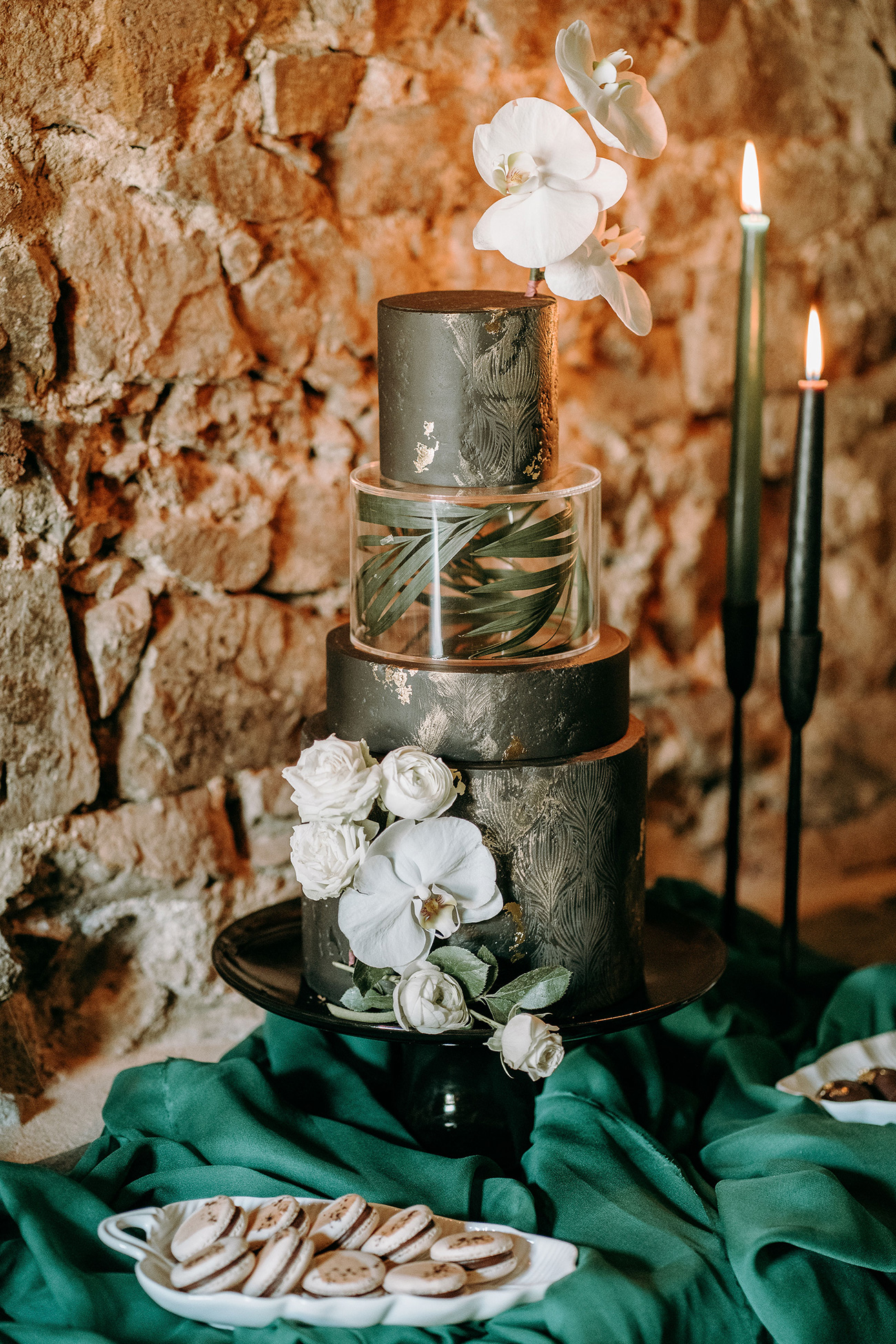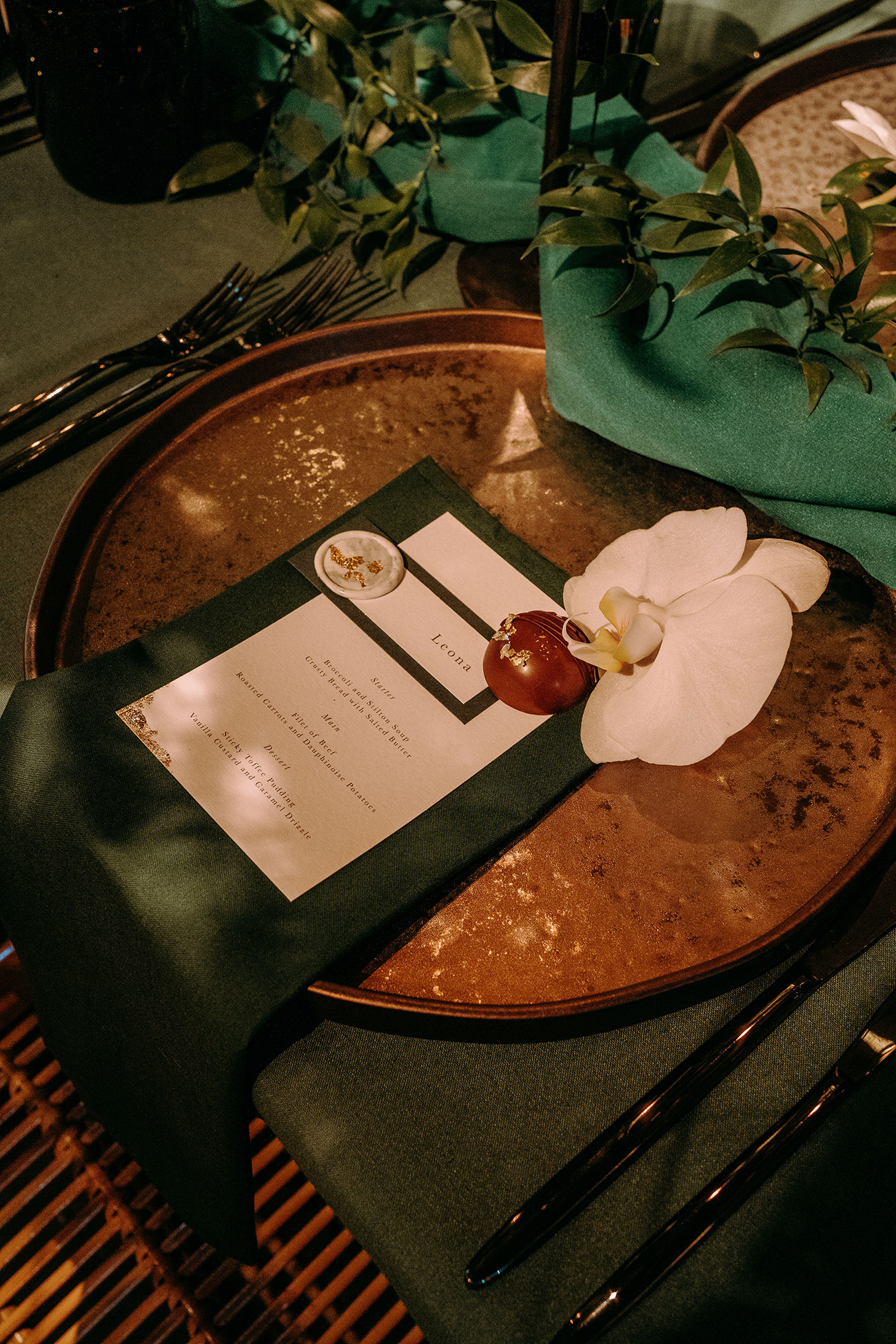 “Using greens as a base colour and layering this up with black and accents of gold made the overall look super modern, illustrating that darker colours can absolutely be used in weddings,” she continues. The waxy green of the monstera leaves and foliage, together with bamboo chairs and orchids, adds an exotic edge.