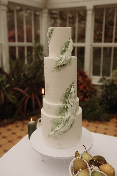 The tablescape epitomises modern refinement: single-stem floral arrangements are paired with pearl-encrusted pears, geometric and chamberstick ceramic candleholders and minimalist clear glassware. Dinner settings feature white charger plates, silver flatware and olive-green napkins, completing the look. Stationery adorned with delicate botanical illustrations and elegant calligraphy echoes the pared-back look, while a four-tier cake, finished with textured ruffle frosting, serves as a piece of edible art.