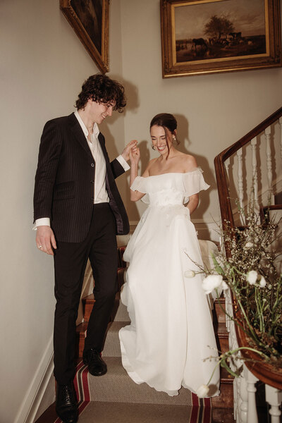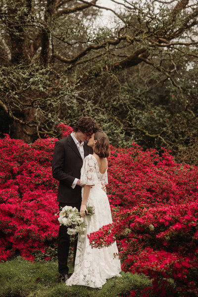 The couple embodies fashion-forward sophistication. His open-shirted, pinstripe two-piece suit exudes laidback charm, while her printed organza flute sleeve gown is the perfectly à la mode accompaniment. A second look sees her in a romantic off-the-shoulder crinkle chiffon dress adorned with 3D silk organza flowers – a perfect balance of vintage glamour and modern bridal trends. Together, they deliver a masterclass in modern romance.