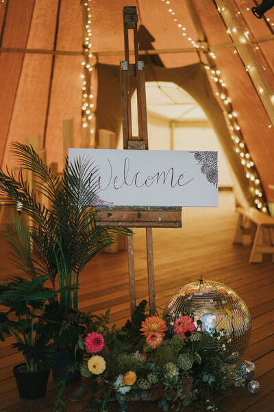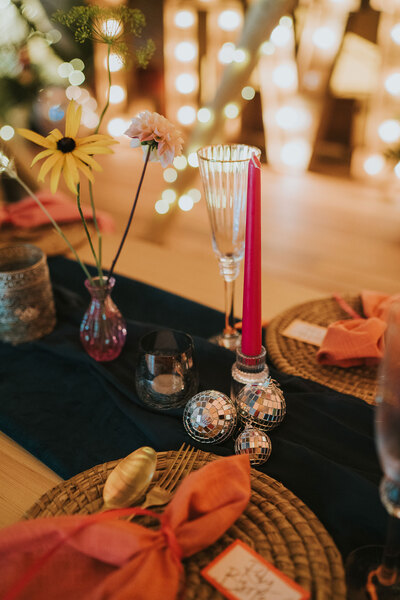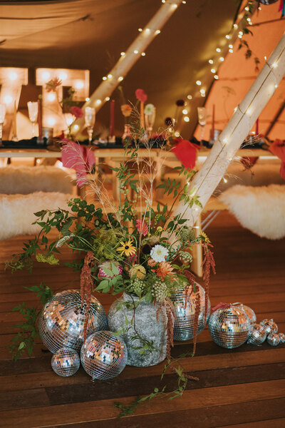 Floristry mixing fresh and dried flowers greets an illuminated ‘Love’ sign, festooned fairy lights and a smattering of glitterballs. Tables decorated with midnight blue runners contrast with the colourful glassware, floral arrangements, napkins and candlesticks all muted by leather Moroccan pouffes, handmade wooden stools and tree stump side tables atop braided jute rugs.