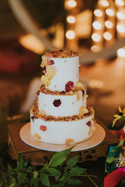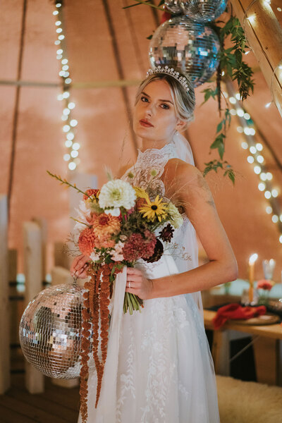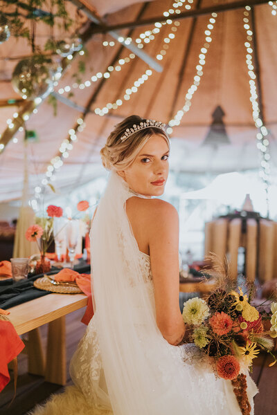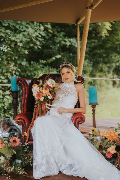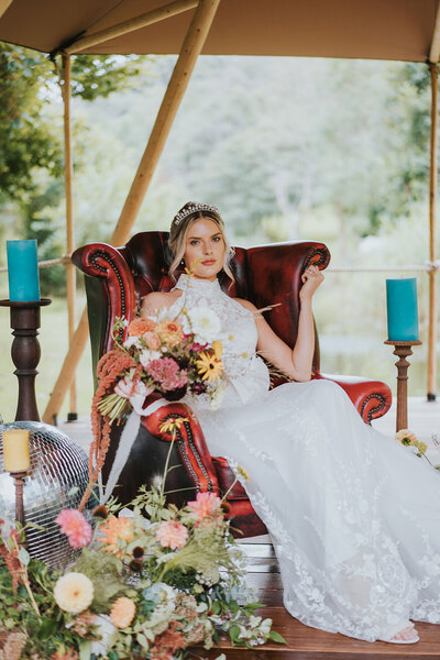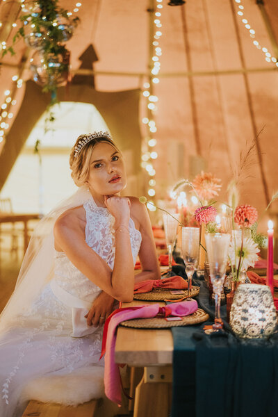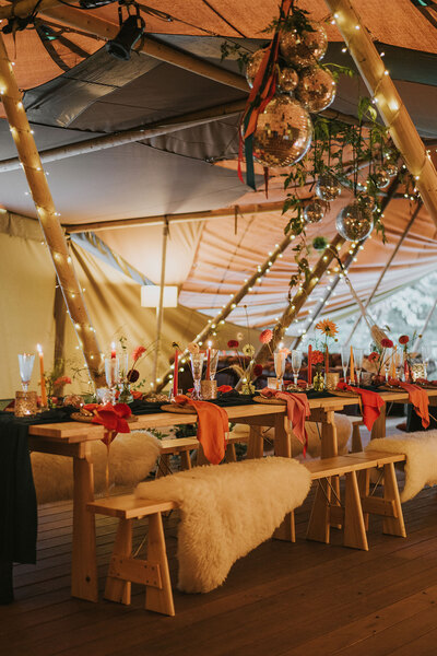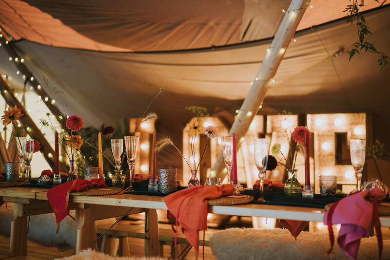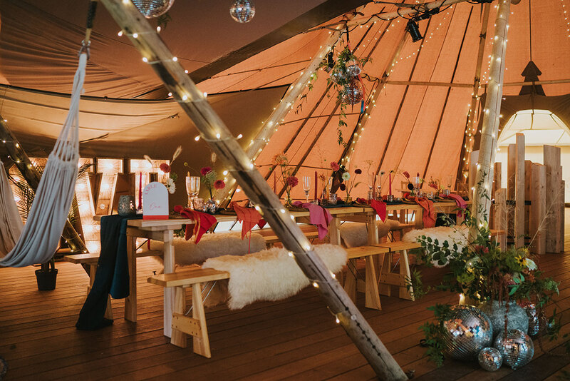 Ornate silver candle-holders, vintage serving trays and gold flatware complete the luxe-edged look, with the cake adorned with dried petals and pearls perfectly blending the two contrasting aesthetics. Sheepskin rugs, aerial installations, potted palms and hammocks draped between the tipi’s poles continue the textured layering, lending the scene a super-cosy, eclectic feel.