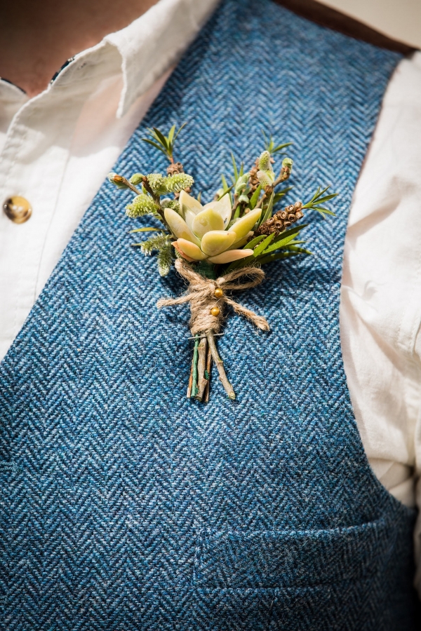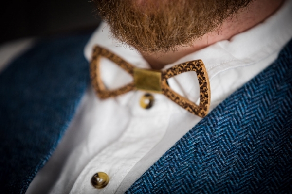 The careful sourcing continues for the groom's outfit, from the organic hemp linings of the tweeds and hemp shirt to the bow tie lovingly crafted from wood and the vegan shoes, which boast a minimal carbon footprint.