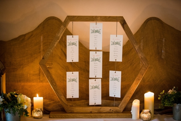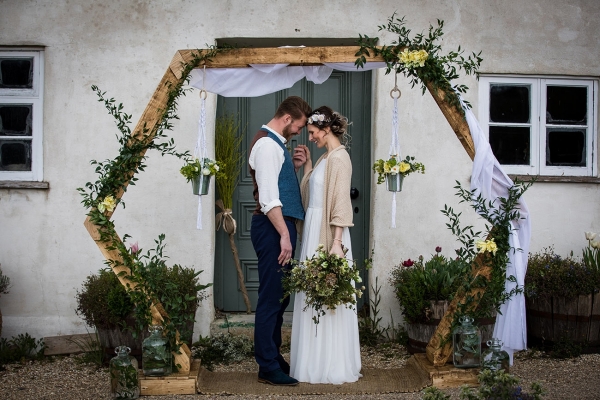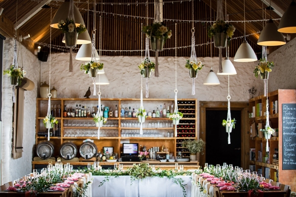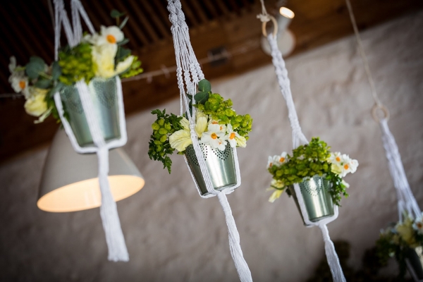 The addition of macramé plant hangers filled with seasonal flowers such as tulips, narcissi, hellebores and lots of foliage add a lush 'just gathered' spring look. 'This created a celling of natural luxury and framed the top table in a unique way,' says Laura. 'Our handmade table plan was strung with matching stationery to the table settings and was naturally at home with the cake and gift area of the room. Outside, our coordinating hexagonal handmade arch framed the bride, groom and celebrant with elegant ease in front of the iconic farmhouse doors.'