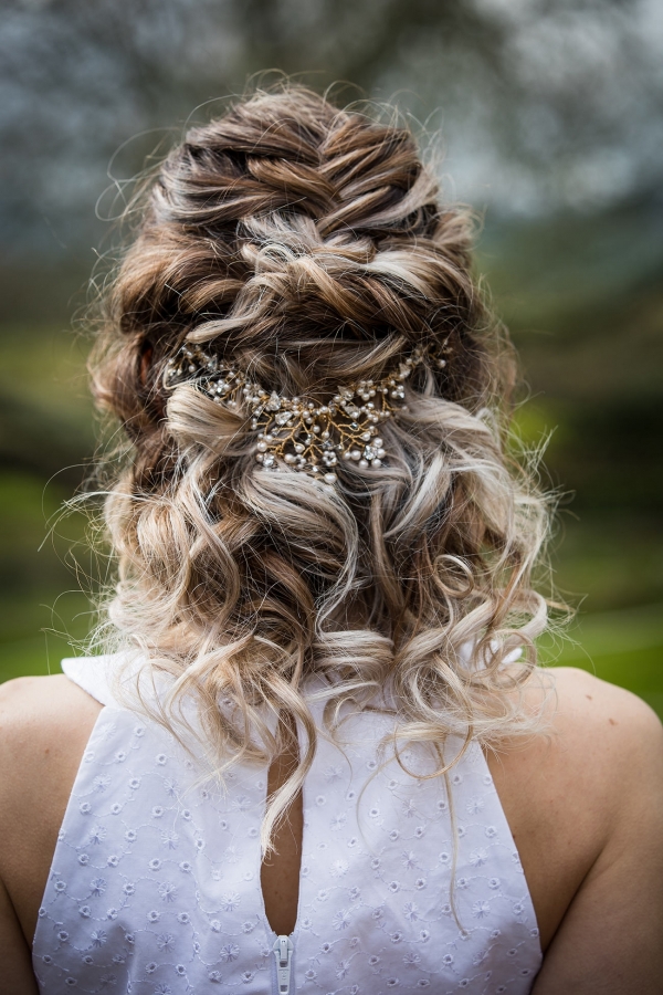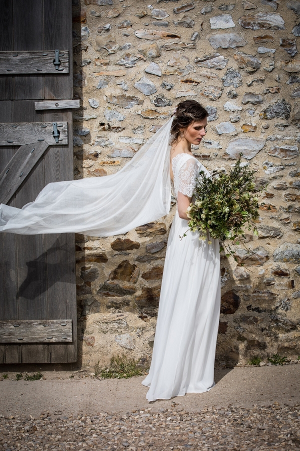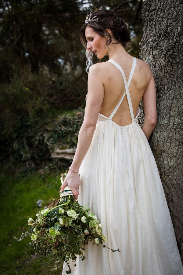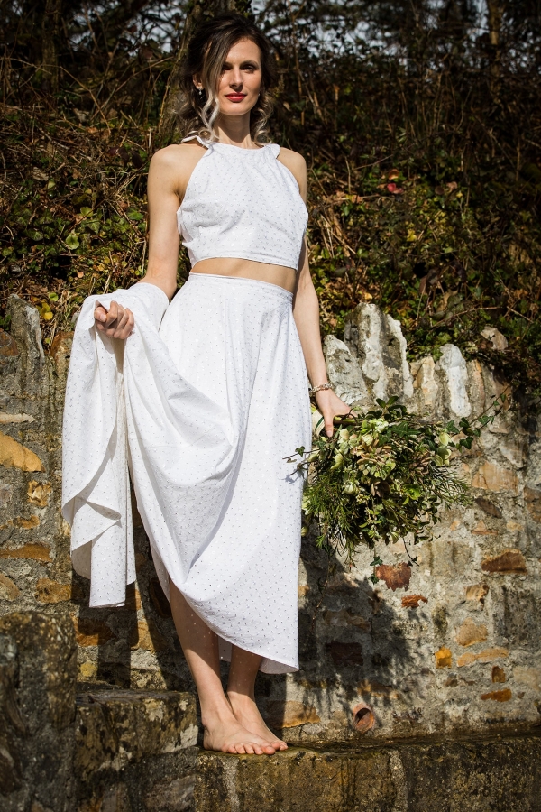 The bridal look captures the mood of the shoot perfectly. Crafted from organic silk, bamboo, French lace and vintage cottons, the dresses marry modern bridal fashions with sustainable and fair trade fabrics. The finishing touches continue the theme: the mantilla shawls are handmade in Devon using ethically sourced natural yarns, while the bridal shoes are ethical and vegan. A soft, textured hairstyle complements the upcycled headpiece, made with 1940s' vintage fabric millinery flowers along with blush vintage pearls and antique beads. Even the make-up products are 'environmentally-friendly, zero-waste, recyclable, carbon neutral, non-toxic, non-GMO, vegan, cruelty-free and made from sustainably sourced ingredients,' says Laura, all while giving a flawless look, combining smoky eyes and a striking pop of coral on the lips.