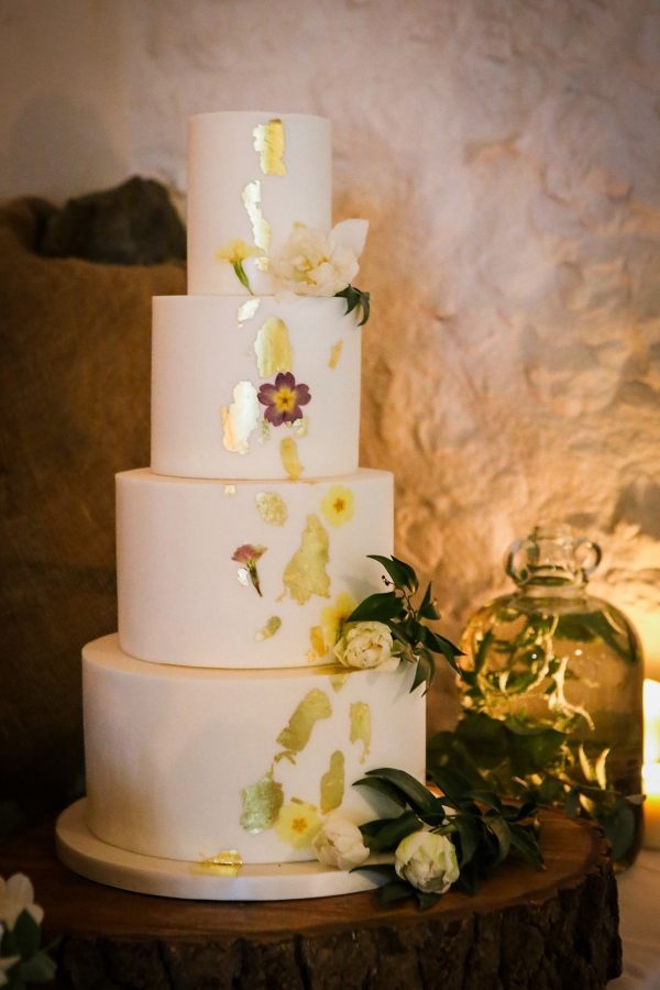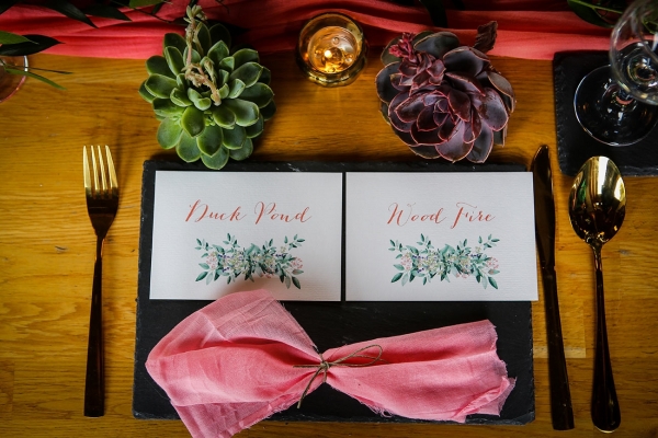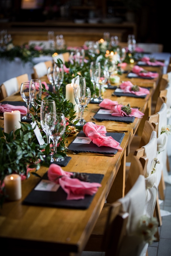 The Threshing Barn is a carnival of colour, blending a natural yet luxurious aesthetic, thanks to an abundance of greenery and hand-dyed coral table runners, made from natural fabrics. 'Slate chargers give depth and contrast to the wooden tables, with gold cutlery and gold tea light holders to bring more luxury elements in,' explains Laura.