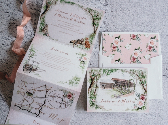 From something simple like adding a venue illustration to one of Knots & Kisses' existing house collections to creating a fully hand-painted bespoke concertina, with borders, venue paintings and small illustrations, Nikki has added illustrations of pets, seaside themes with shells and deckchairs, and woodland motifs with fern and bluebell borders.