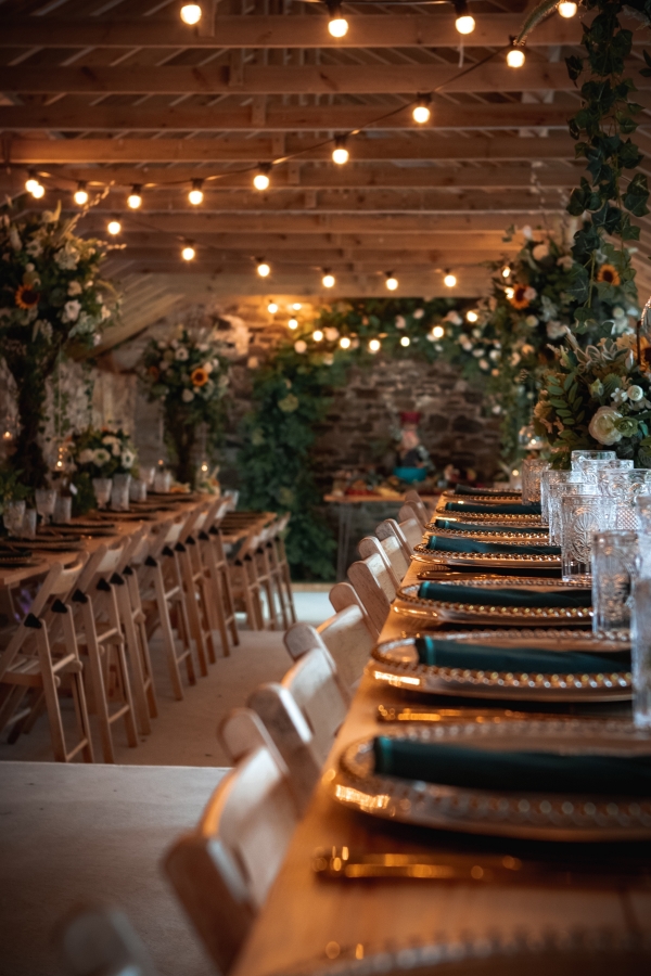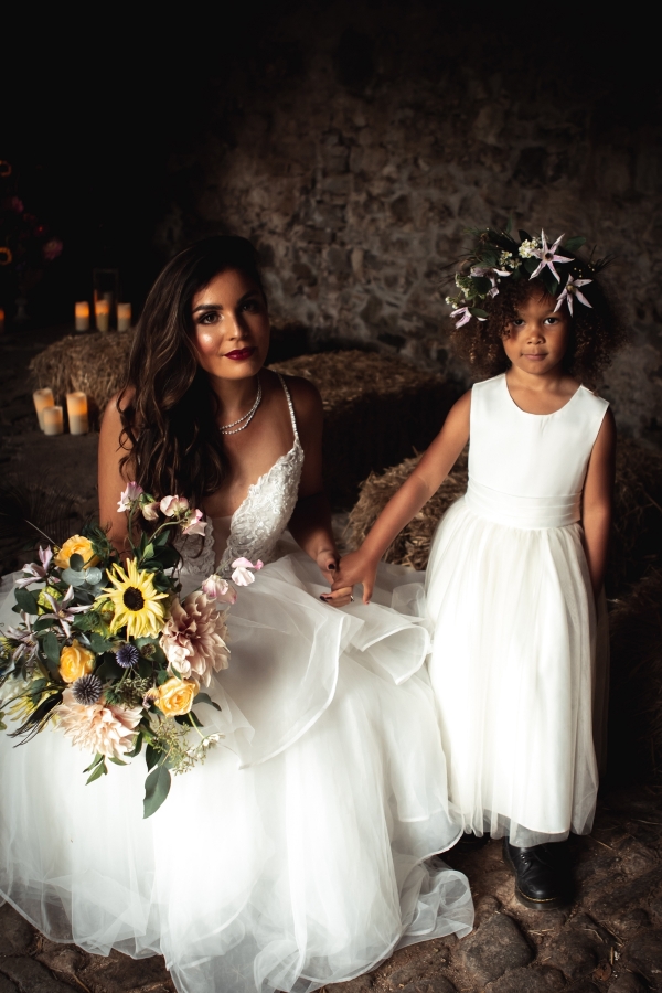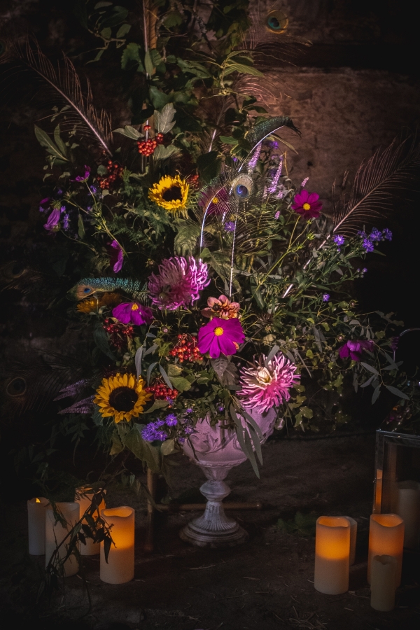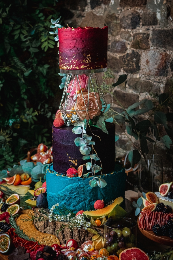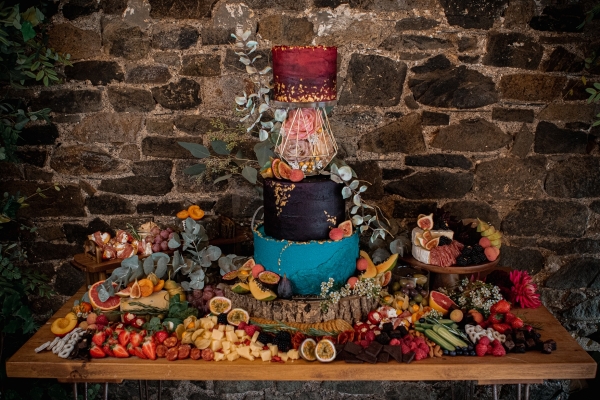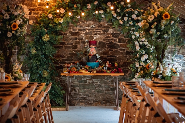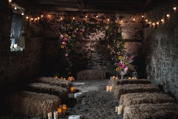 The cake is a riot of colour and texture, and is flanked by a smattering of the season's edible spoils to give a feast for all the senses, while subtle candlelight and bulbs strung across the ceiling help achieve the cosy and relaxed ambience. The ceremony room is an intimate blending of rustic hay bale, stone flooring and romantic low lighting via candles lining the aisle and lanterns perched by the window.