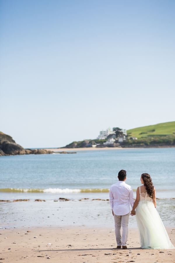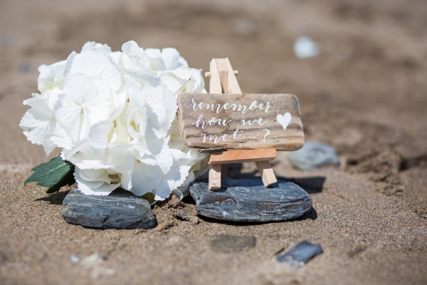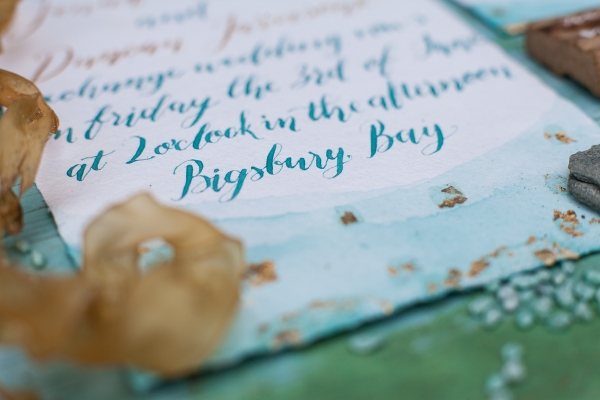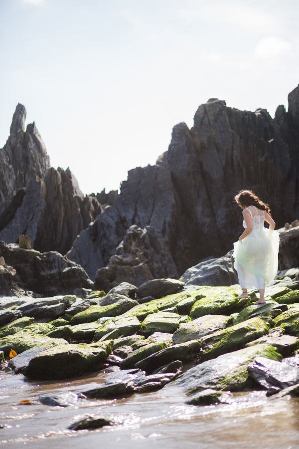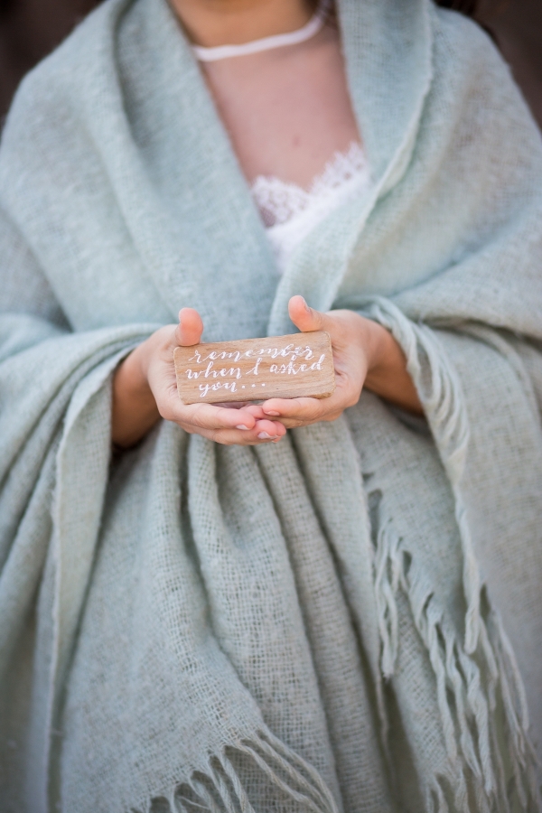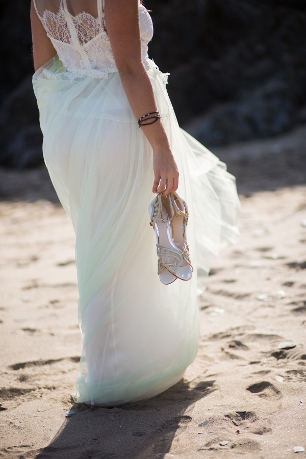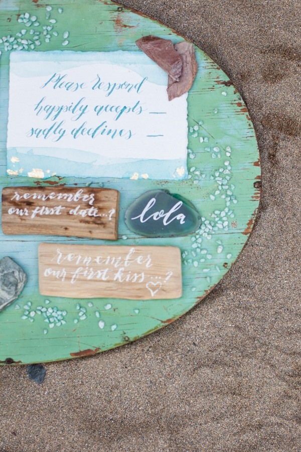 The romantic shoot involved Juan leading Carolina to a gorgeous green dip-dyed floaty dress and shoes. She then followed a path of clues, all calligraphed on driftwood,