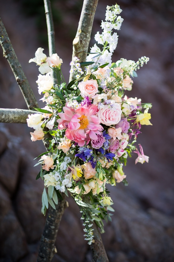 "Our palette was sea green and sand with touches of pink and gold - a beautiful contrast to the slate grey backdrop," she says. An array of palettes, rugs and cushions helped achieve the relaxed vibe, while hazel branches bedecked with flowers and ribbon created a pretty backdrop, and popped with colour against the rocks.